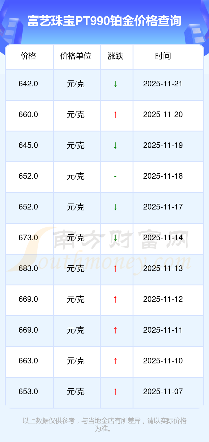 今日富藝珠寶所公布的 PT990鉑金最新價(jià)格為642.0元/克。