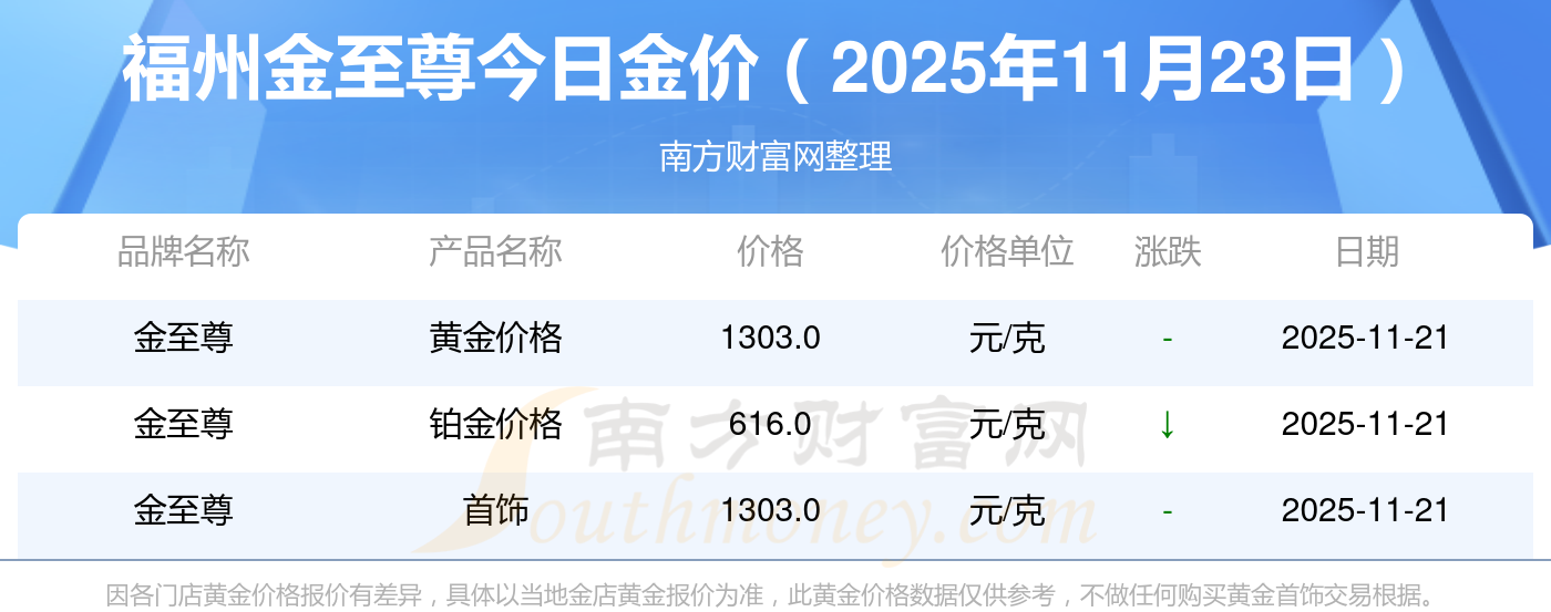 2025年11月23日福州金至尊黃金的單價(jià),一克為多少?黃金價(jià)格1305.0元/克,鉑金價(jià)格616.0元/克,飾品金價(jià)(內(nèi)地)1305.0元/克,黃金飾品(香港)45110.0,鉑金價(jià)格(香港)17570.0,金條價(jià)格(香港)40690.0,金條金價(jià)(內(nèi)地)1143.0元/克,黃金價(jià)格1298.0元/克,鉑金價(jià)格600.0元/克,足金價(jià)格1298.0元/克,黃金價(jià)格1266.0元/克。
