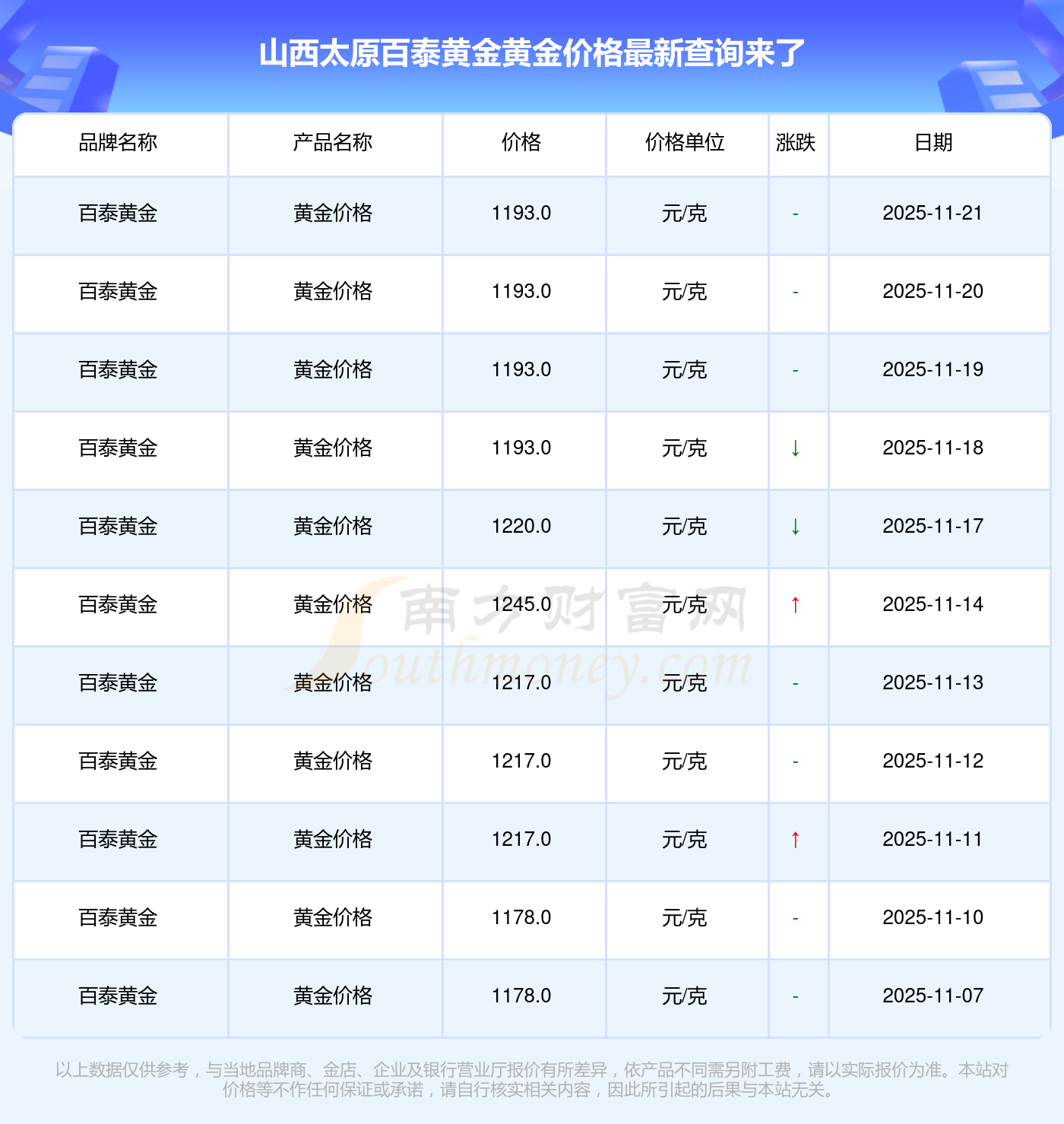 2025年11月23日,山西太原百泰黃金黃金價格每克的價值量定格在1193.0元/克。