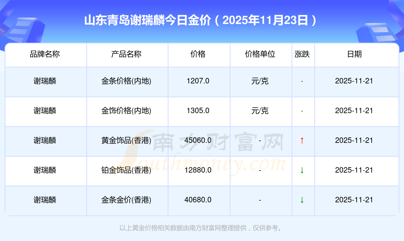 想查詢當(dāng)下黃金價(jià)格,今日黃金一克的價(jià)格是多少呢?2025年11月23日山東青島謝瑞麟現(xiàn)在黃金一克要多少錢:黃金價(jià)格1305.0元/克,鉑金價(jià)格616.0元/克,飾品金價(jià)(內(nèi)地)1305.0元/克,黃金飾品(香港)45110.0,鉑金價(jià)格(香港)17570.0,金條價(jià)格(香港)40690.0,金條金價(jià)(內(nèi)地)1143.0元/克,黃金價(jià)格1298.0元/克,鉑金價(jià)格600.0元/克,足金價(jià)格1298.0元/克,黃金價(jià)格1266.0元/克。