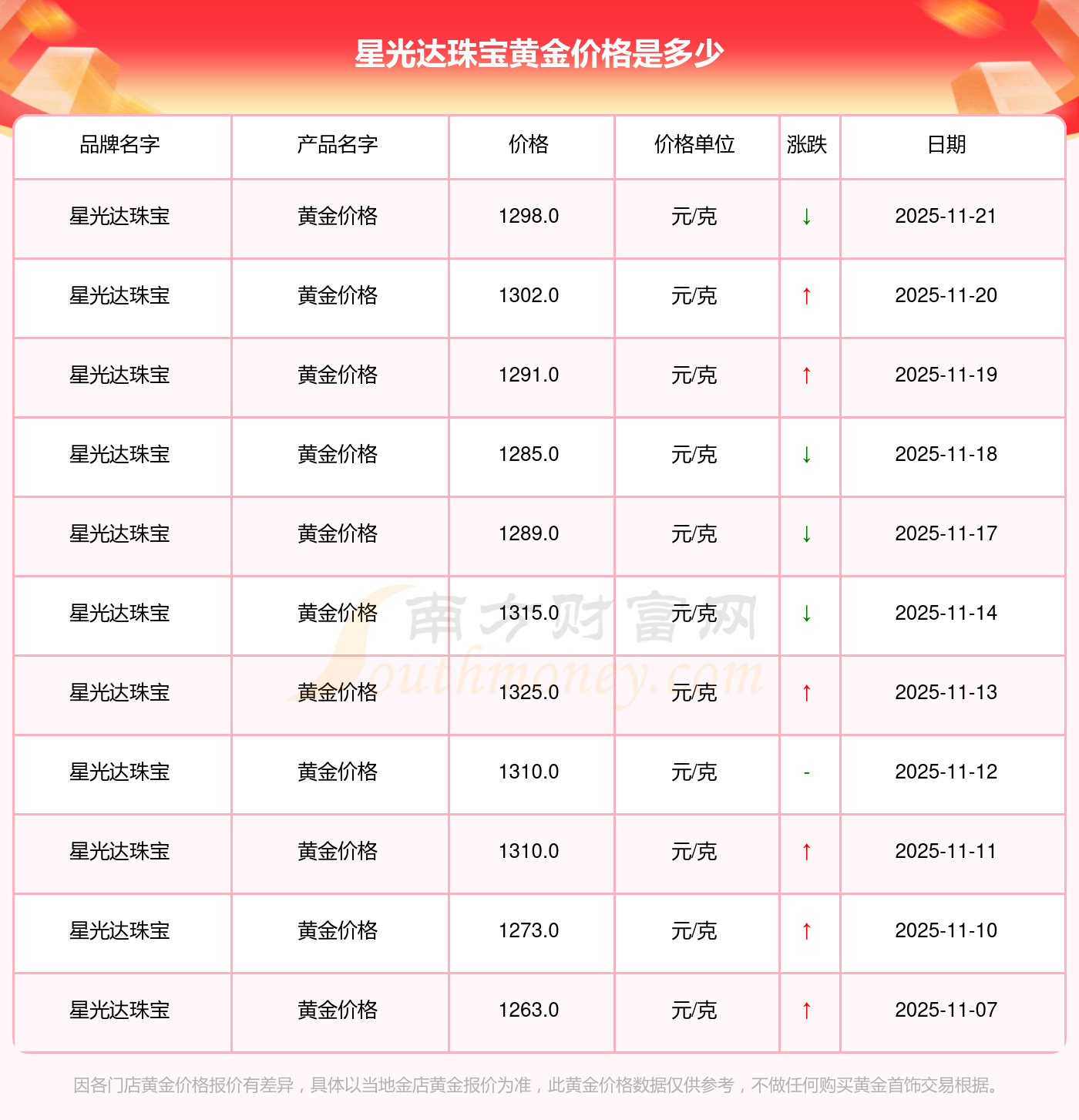 今天星光達珠寶黃金價格每克多少錢,最新星光達珠寶黃金價格表,一起來看看吧!