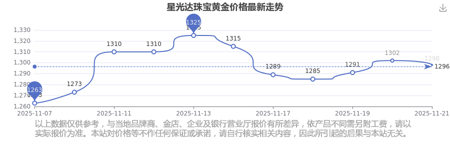 據(jù)了解,星光達珠寶今日黃金價格為1298.0元/克。