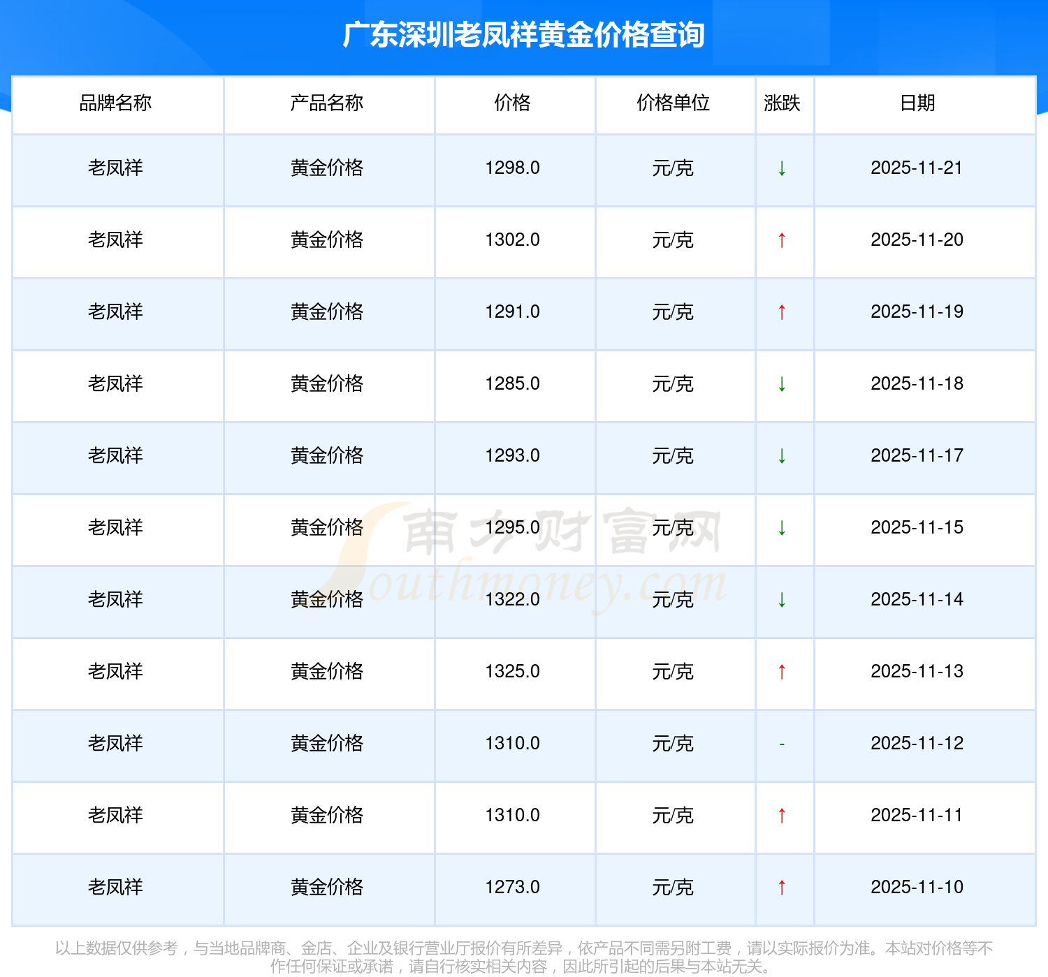 1298.0元/克,此乃廣東深圳老鳳祥于 2025年11月23日黃金價(jià)格的掛牌價(jià)格。