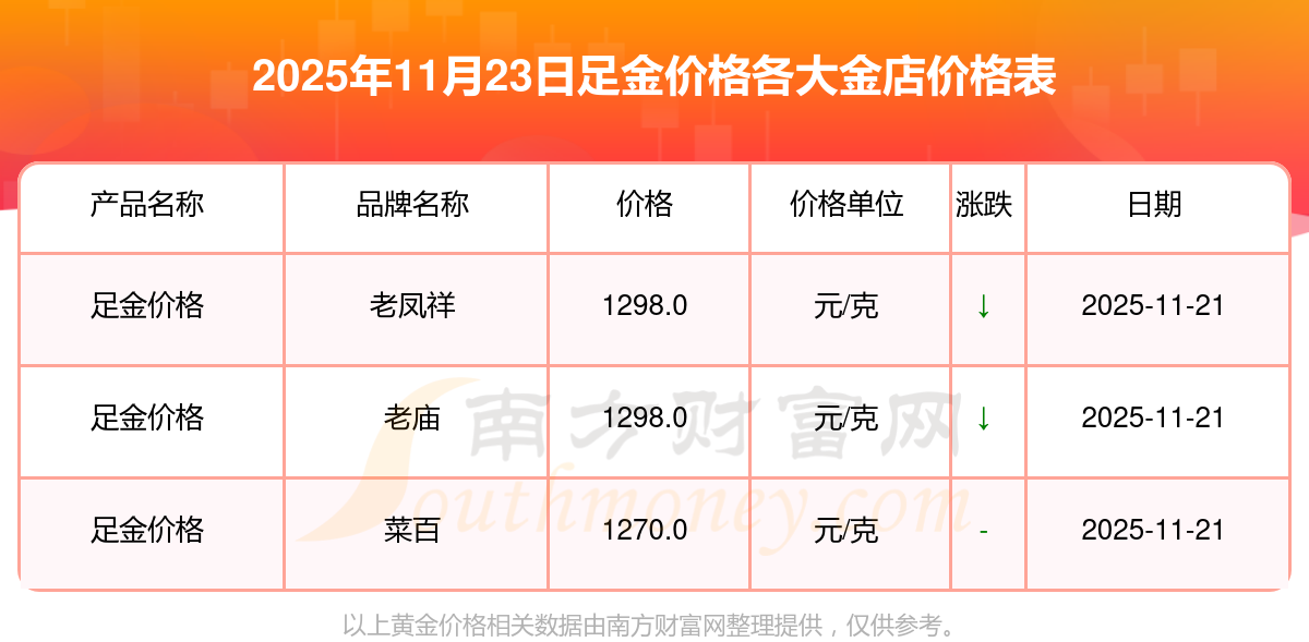 2025年11月23日周大福、周大福、周大福、周大福、周大福、周大福、周大福、老鳳祥、老鳳祥、老鳳祥、周六福等各大金店品牌足金價格最新價格如下:周大福黃金價格1305.0元/克,周大福鉑金價格616.0元/克,周大福飾品金價(內(nèi)地)1305.0元/克,周大福黃金飾品(香港)45110.0,周大福鉑金價格(香港)17570.0,周大福金條價格(香港)40690.0,周大福金條金價(內(nèi)地)1143.0元/克,老鳳祥黃金價格1298.0元/克,老鳳祥鉑金價格600.0元/克,老鳳祥足金價格1298.0元/克,周六福黃金價格1266.0元/克。