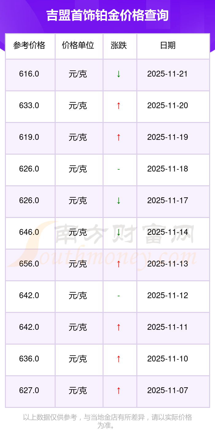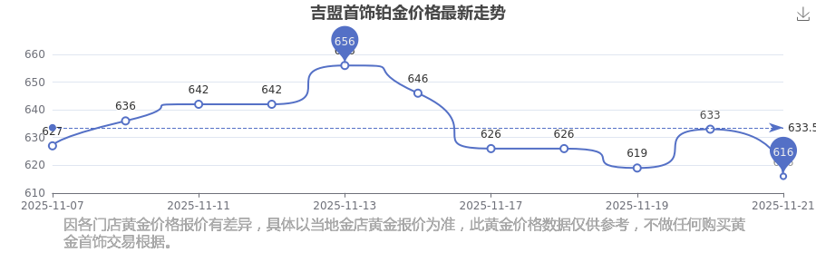 目前吉盟首飾 鉑金價格的價格,今日最新為616.0元/克。