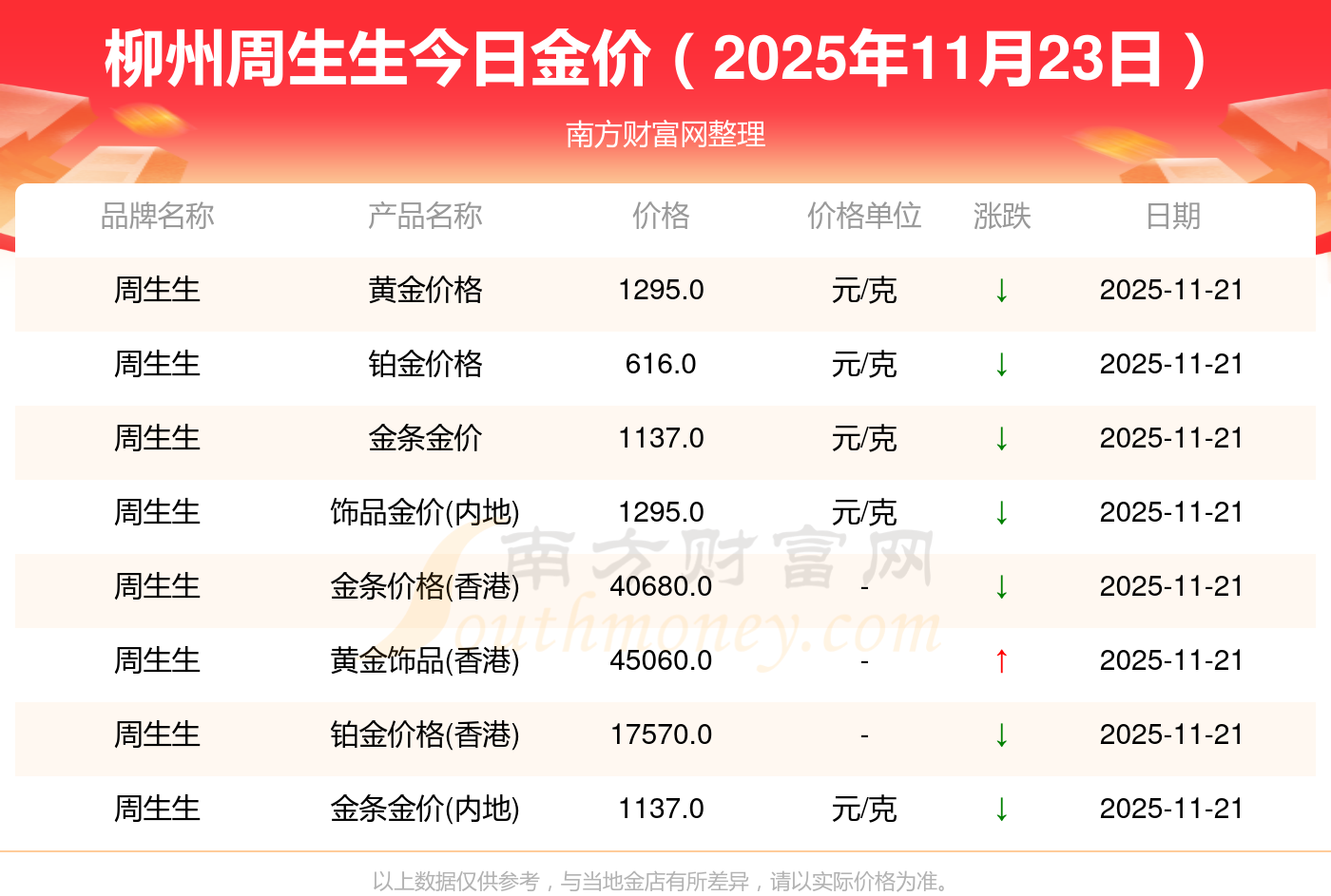 2025年11月23日柳州周生生現(xiàn)在購買一克黃金需要支付多少錢?黃金價(jià)格1305.0元/克,鉑金價(jià)格616.0元/克,飾品金價(jià)(內(nèi)地)1305.0元/克,黃金飾品(香港)45110.0,鉑金價(jià)格(香港)17570.0,金條價(jià)格(香港)40690.0,金條金價(jià)(內(nèi)地)1143.0元/克,黃金價(jià)格1298.0元/克,鉑金價(jià)格600.0元/克,足金價(jià)格1298.0元/克,黃金價(jià)格1266.0元/克。