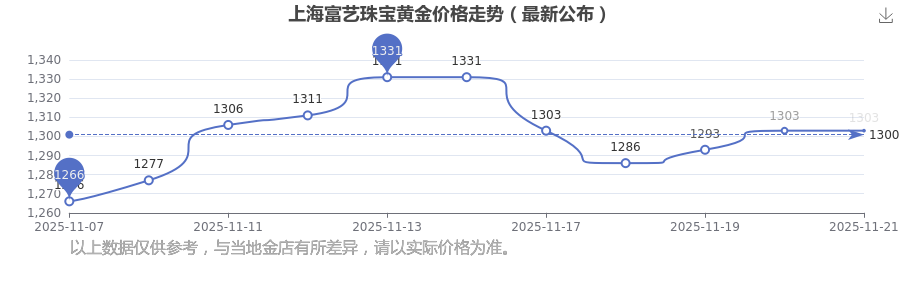 上海富藝珠寶黃金價(jià)格在 2025年11月23日為 1303.0元/克。