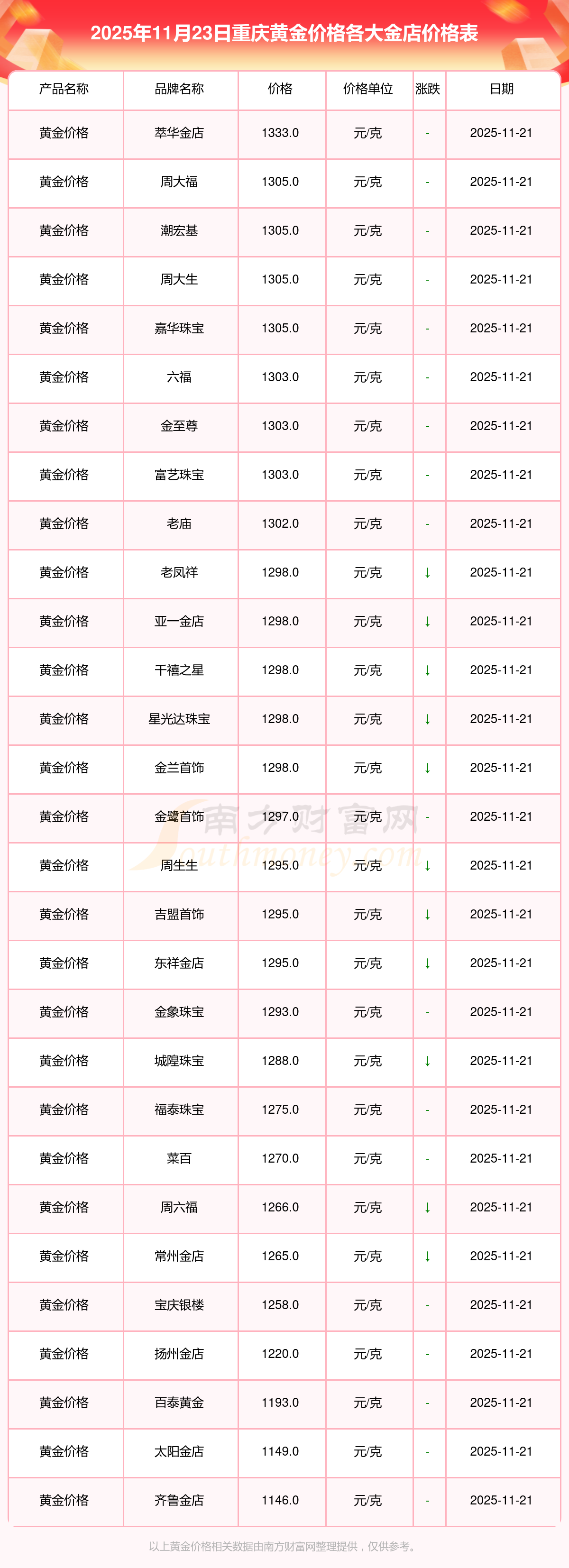 2025年11月23日,重慶周大福、周大福、周大福、周大福、周大福、周大福、周大福、老鳳祥、老鳳祥、老鳳祥、周六福等各大金店品牌黃金價(jià)格今日價(jià)格如下:周大福1305.0元/克、周大福616.0元/克、周大福1305.0元/克、周大福45110.0、周大福17570.0、周大福40690.0、周大福1143.0元/克、老鳳祥1298.0元/克、老鳳祥600.0元/克、老鳳祥1298.0元/克、周六福1266.0元/克。