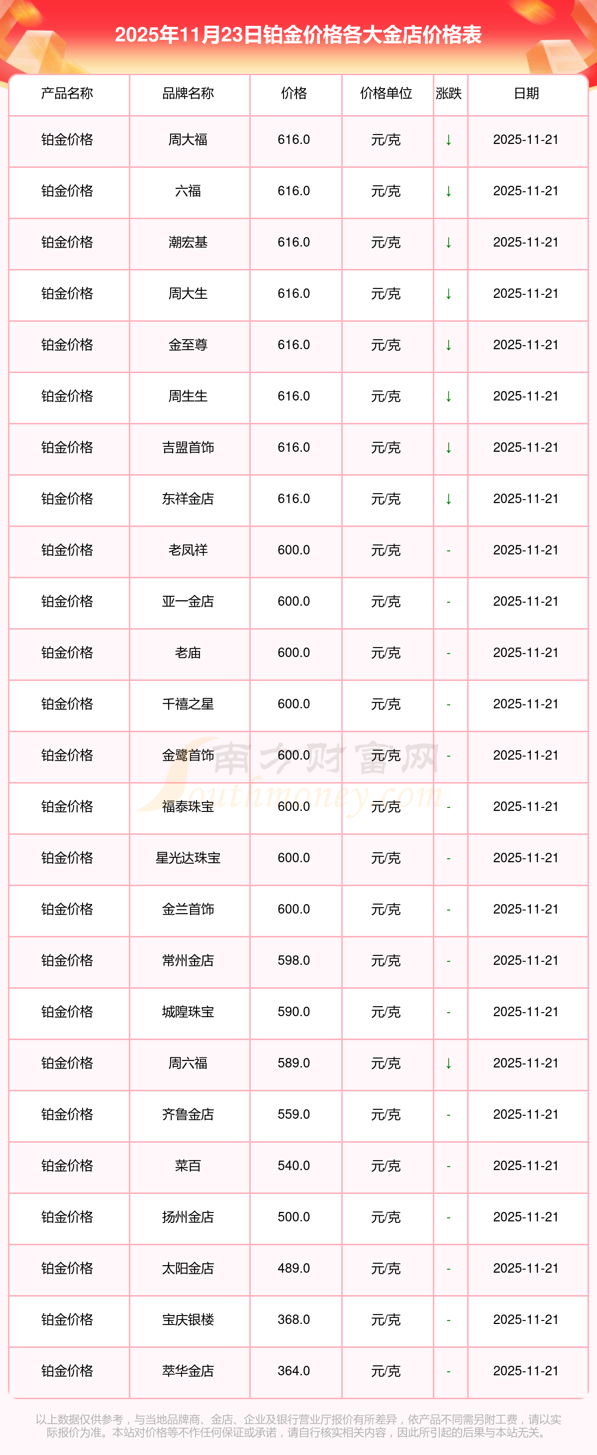 2025年11月23日各大金店鉑金價格最新價格:周大福1305.0元/克,周大福616.0元/克,周大福1305.0元/克,周大福45110.0,周大福17570.0,周大福40690.0,周大福1143.0元/克,老鳳祥1298.0元/克,老鳳祥600.0元/克,老鳳祥1298.0元/克,周六福1266.0元/克。