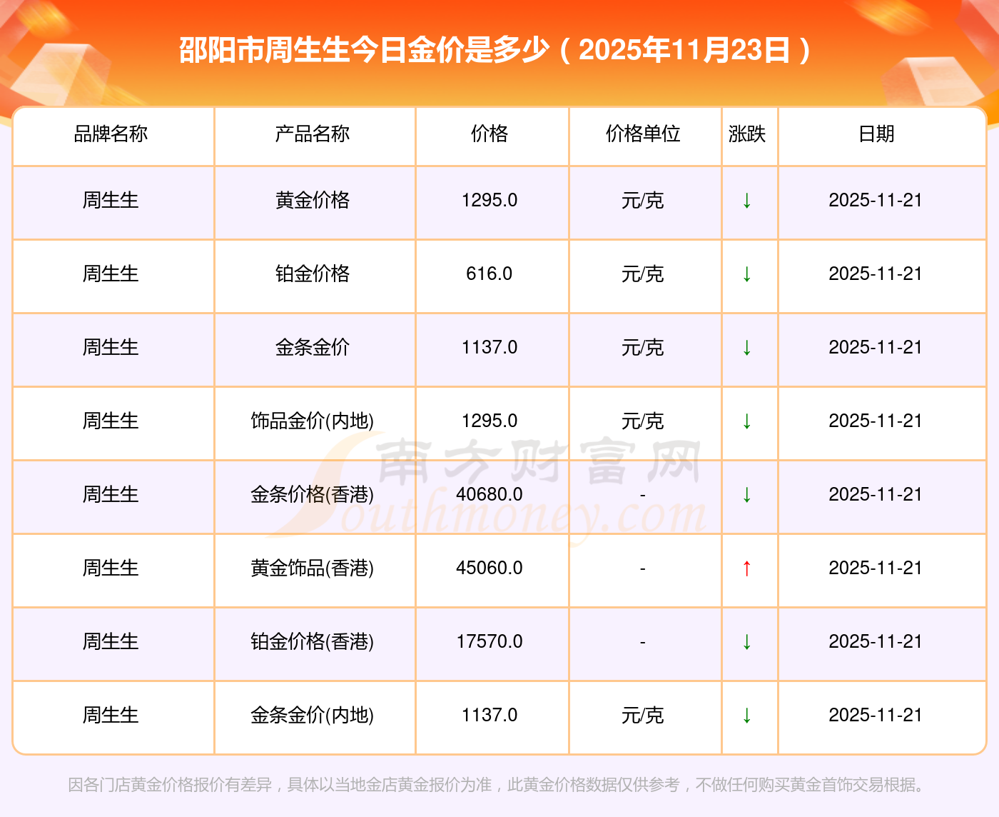 現(xiàn)在邵陽市周生生黃金價格表_邵陽市周生生黃金多少錢一克(2025年11月23日)