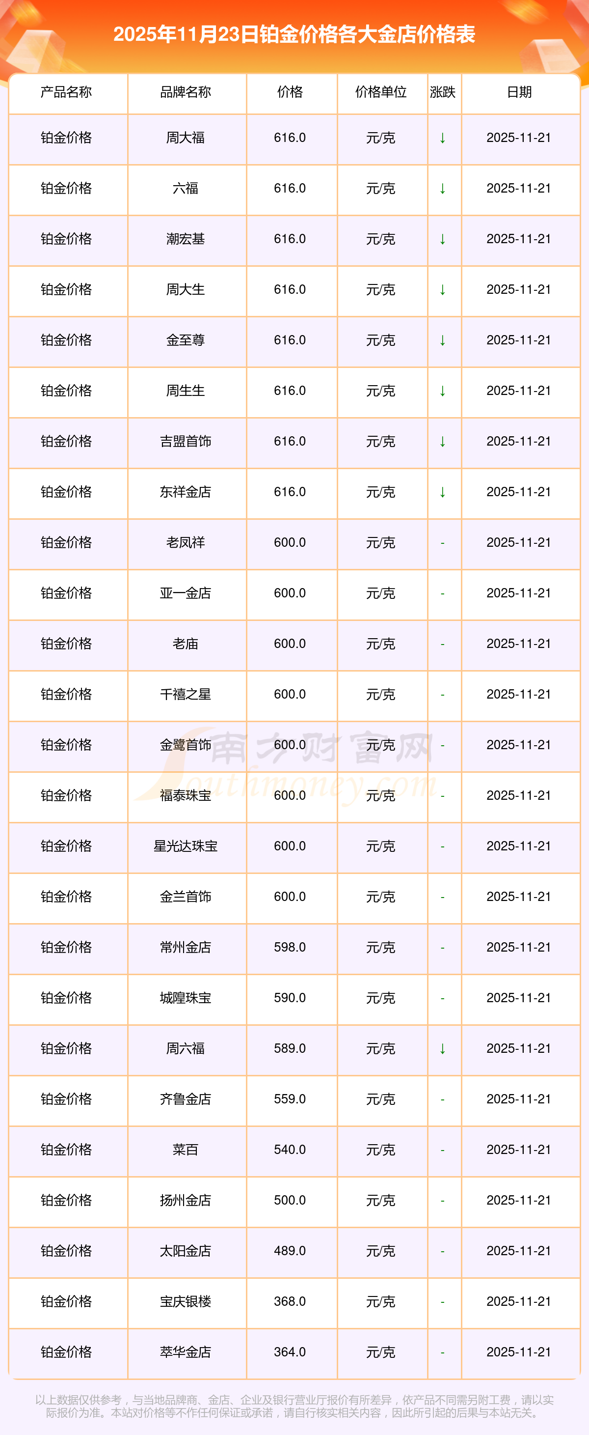 2025年11月23日周大福、周大福、周大福、周大福、周大福、周大福、周大福、老鳳祥、老鳳祥、老鳳祥、周六福等各大金店品牌鉑金價(jià)格最新價(jià)格如下:周大福黃金價(jià)格1305.0元/克,周大福鉑金價(jià)格616.0元/克,周大福飾品金價(jià)(內(nèi)地)1305.0元/克,周大福黃金飾品(香港)45110.0,周大福鉑金價(jià)格(香港)17570.0,周大福金條價(jià)格(香港)40690.0,周大福金條金價(jià)(內(nèi)地)1143.0元/克,老鳳祥黃金價(jià)格1298.0元/克,老鳳祥鉑金價(jià)格600.0元/克,老鳳祥足金價(jià)格1298.0元/克,周六福黃金價(jià)格1266.0元/克。