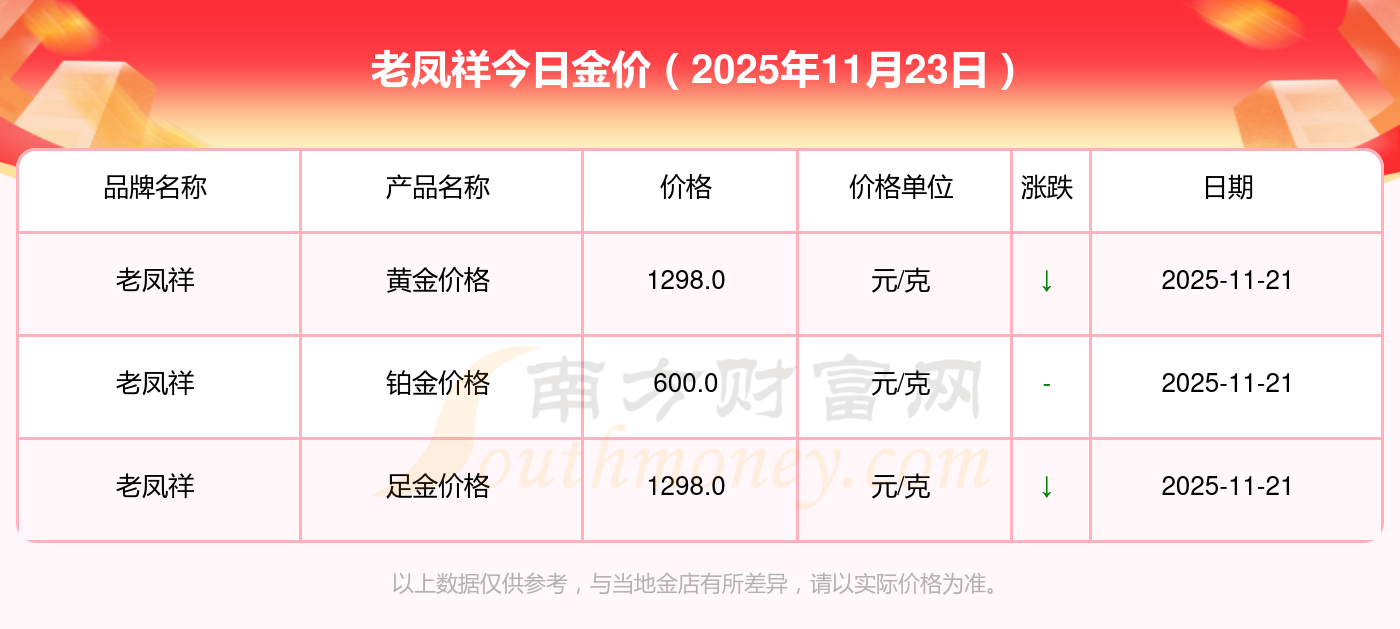 2025年11月23日,周大福、周大福、周大福、周大福、周大福、周大福、周大福、老鳳祥、老鳳祥、老鳳祥、周六福等各大金店品牌黃金價(jià)格今日價(jià)格如下:周大福1305.0元/克、周大福616.0元/克、周大福1305.0元/克、周大福45110.0、周大福17570.0、周大福40690.0、周大福1143.0元/克、老鳳祥1298.0元/克、老鳳祥600.0元/克、老鳳祥1298.0元/克、周六福1266.0元/克。