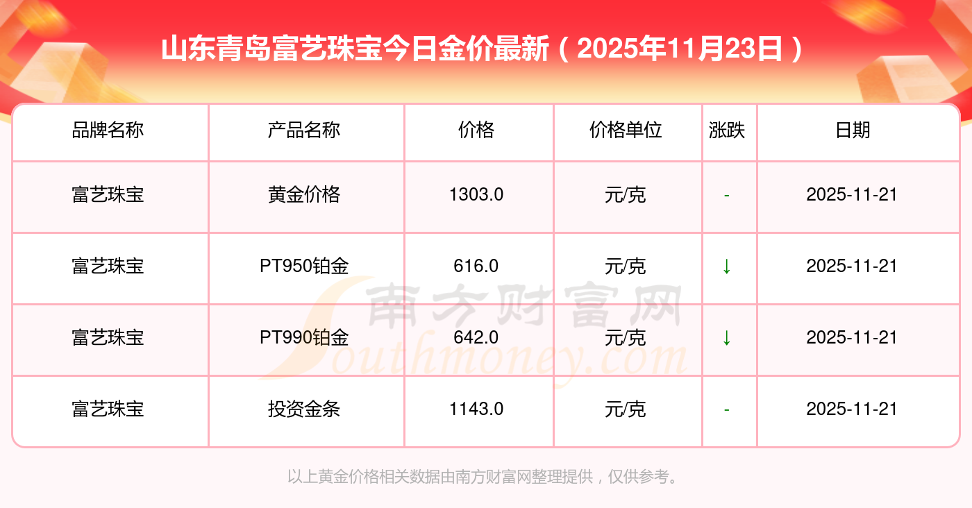 2025年11月23日山東青島富藝珠寶一克黃金對應(yīng)的價格是多少?黃金價格1305.0元/克,鉑金價格616.0元/克,飾品金價(內(nèi)地)1305.0元/克,黃金飾品(香港)45110.0,鉑金價格(香港)17570.0,金條價格(香港)40690.0,金條金價(內(nèi)地)1143.0元/克,黃金價格1298.0元/克,鉑金價格600.0元/克,足金價格1298.0元/克,黃金價格1266.0元/克。