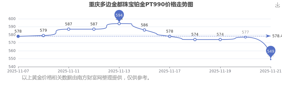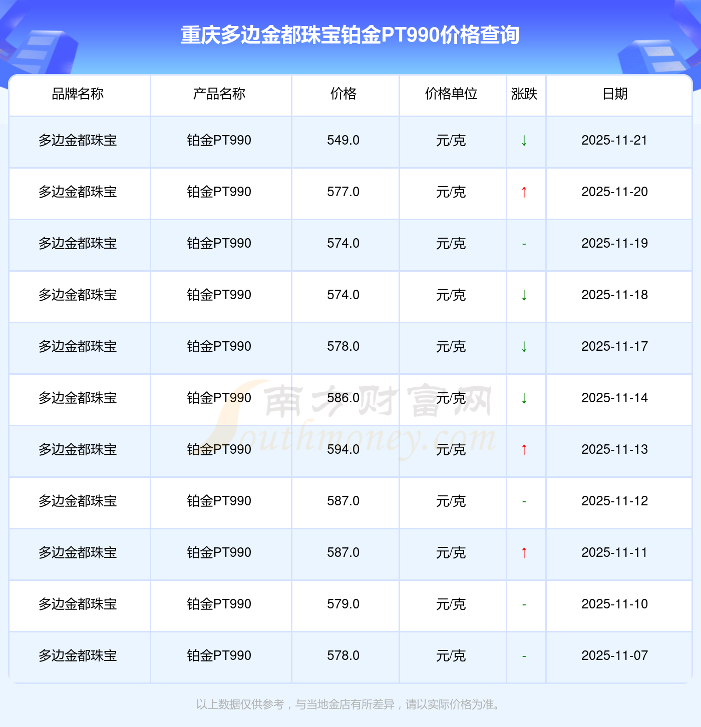 2025年11月23日,重慶多邊金都珠寶所售鉑金PT990,其價(jià)格設(shè)定為 549.0元/克。