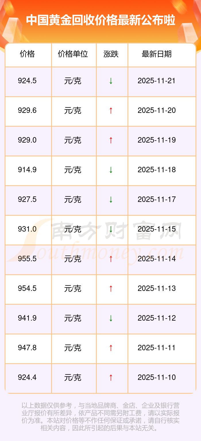 中國黃金今日 回收價(jià)的最新市場行情價(jià)為924.5元/克。