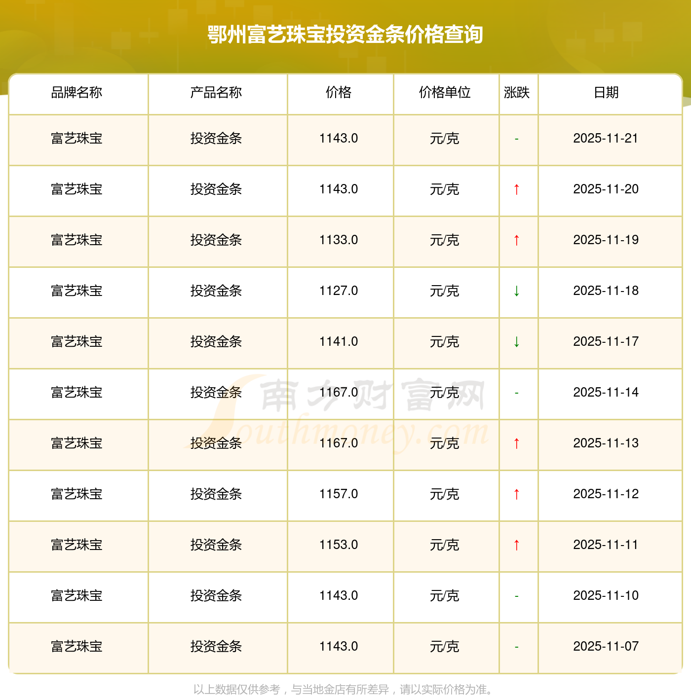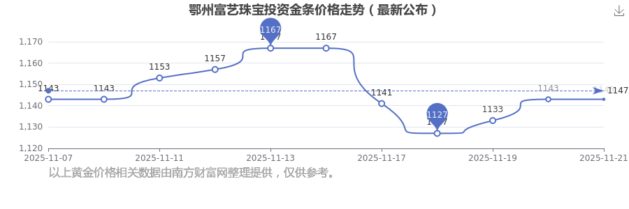 2025年11月23日,鄂州富藝珠寶投資金條每克的售賣價位為1143.0元/克。