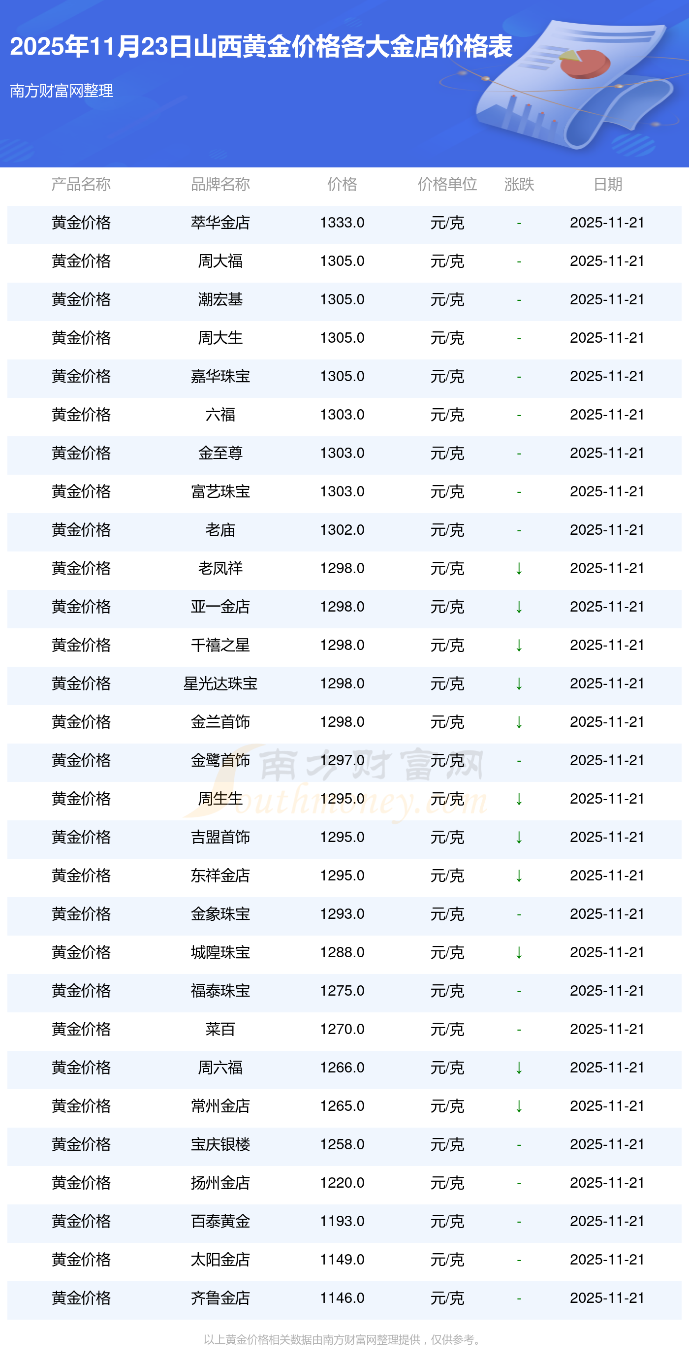 2025年11月23日山西周大福、周大福、周大福、周大福、周大福、周大福、周大福、老鳳祥、老鳳祥、老鳳祥、周六福等各大金店品牌黃金價(jià)格最新價(jià)格如下:周大福黃金價(jià)格1305.0元/克,周大福鉑金價(jià)格616.0元/克,周大福飾品金價(jià)(內(nèi)地)1305.0元/克,周大福黃金飾品(香港)45110.0,周大福鉑金價(jià)格(香港)17570.0,周大福金條價(jià)格(香港)40690.0,周大福金條金價(jià)(內(nèi)地)1143.0元/克,老鳳祥黃金價(jià)格1298.0元/克,老鳳祥鉑金價(jià)格600.0元/克,老鳳祥足金價(jià)格1298.0元/克,周六福黃金價(jià)格1266.0元/克。