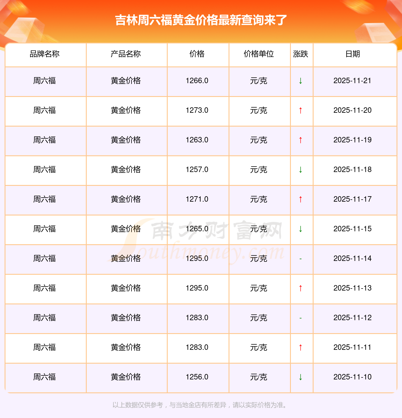 吉林周六福 2025年11月23日的黃金價格價位為 1266.0元/克。