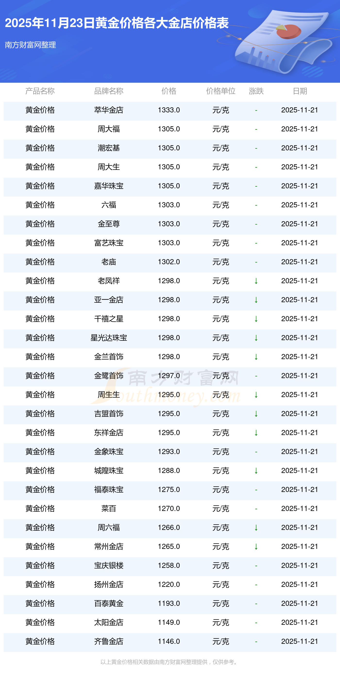 2025年11月23日,周大福、周大福、周大福、周大福、周大福、周大福、周大福、老鳳祥、老鳳祥、老鳳祥、周六福等各大金店品牌黃金價格今日價格如下:周大福1305.0元/克、周大福616.0元/克、周大福1305.0元/克、周大福45110.0、周大福17570.0、周大福40690.0、周大福1143.0元/克、老鳳祥1298.0元/克、老鳳祥600.0元/克、老鳳祥1298.0元/克、周六福1266.0元/克。