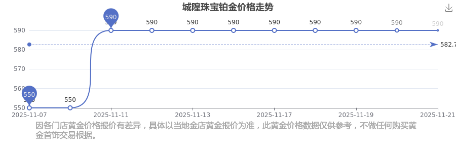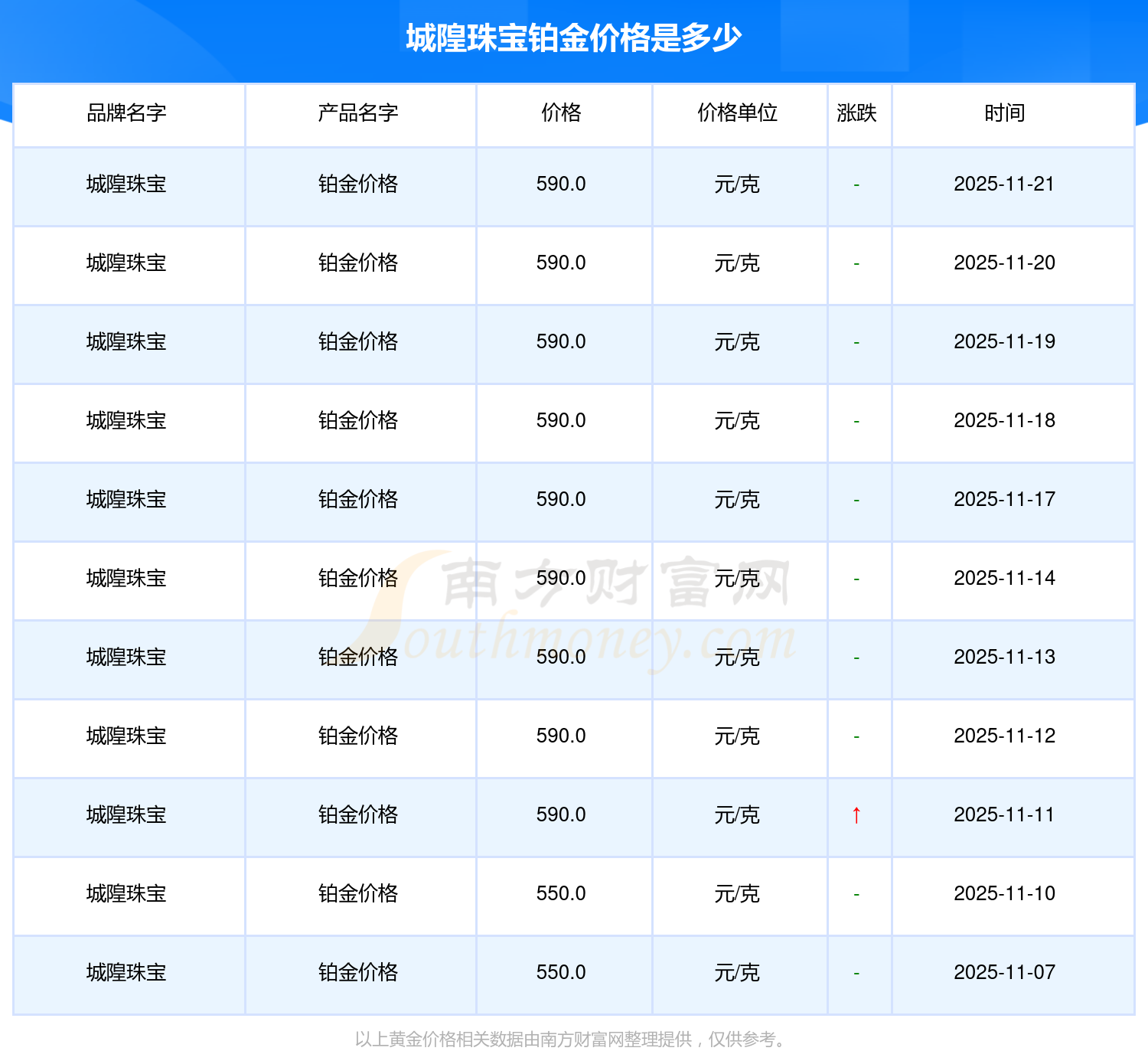 今日(2025年11月23日)城隍珠寶鉑金價格是590.0元/克。