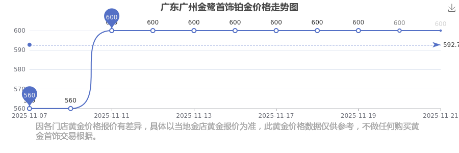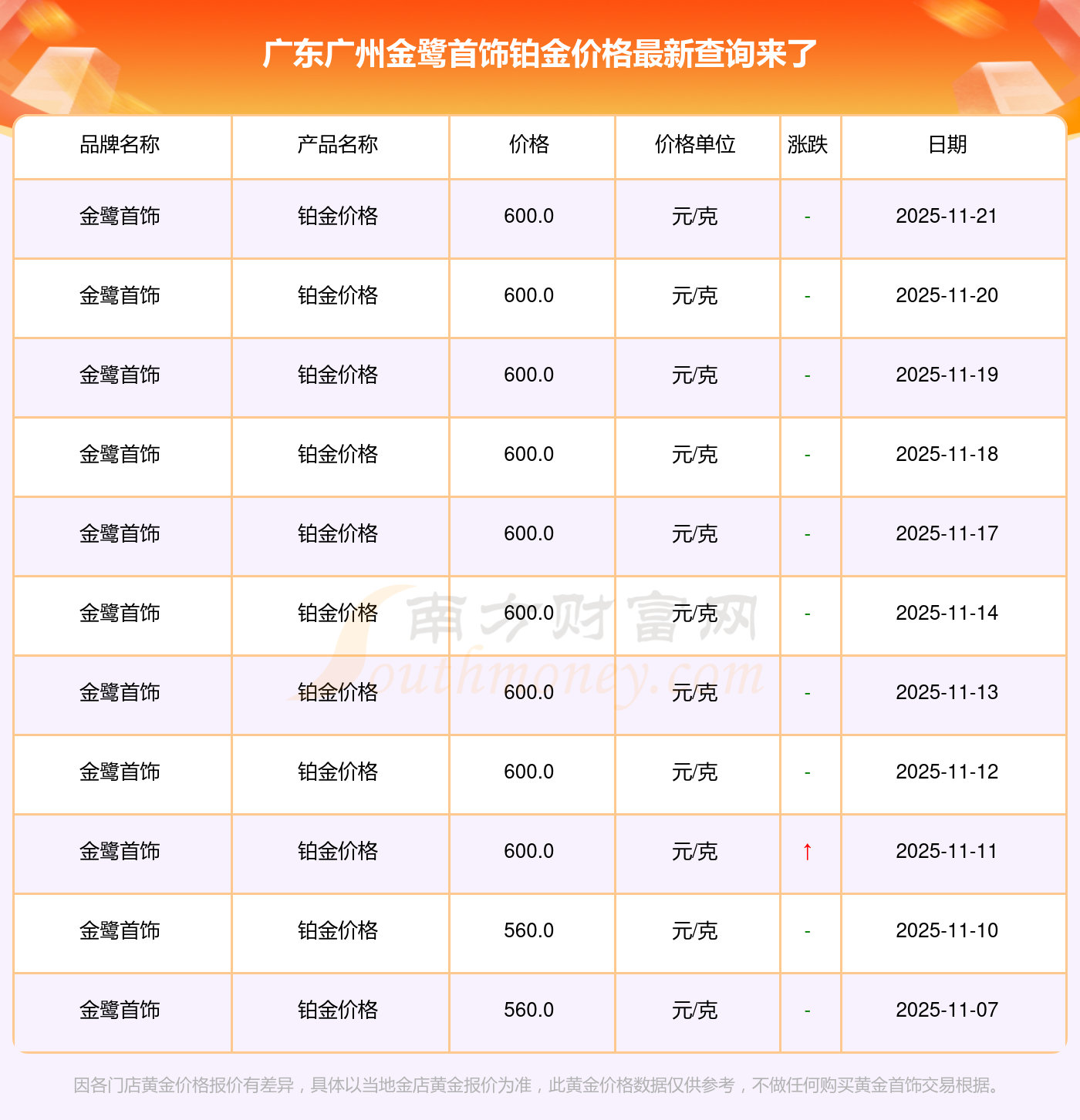 2025年11月23日,廣東廣州金鷺首飾鉑金價格每克的售賣價位為600.0元/克。