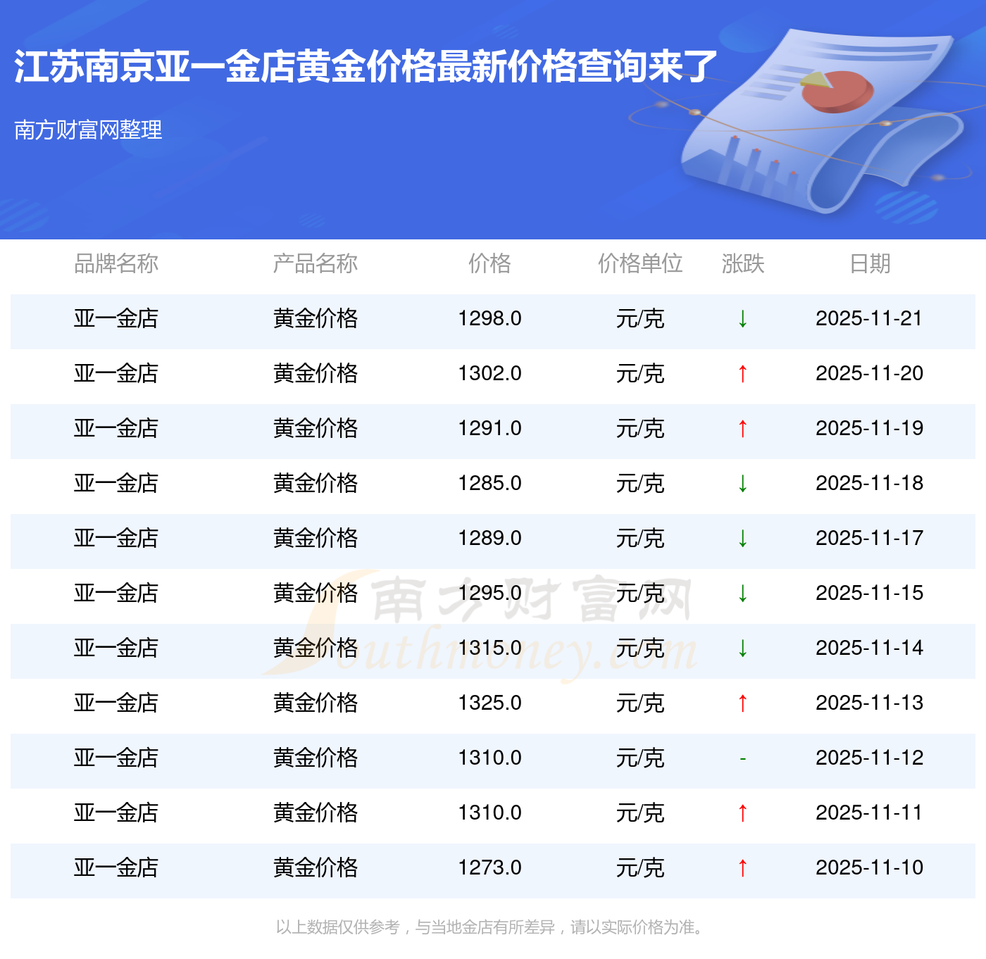 今日江蘇南京亞一金店黃金價格公布黃金價格今天多少一克江蘇南京亞一金店 2025年11月23日的黃金價格價位為 1298.0元/克。