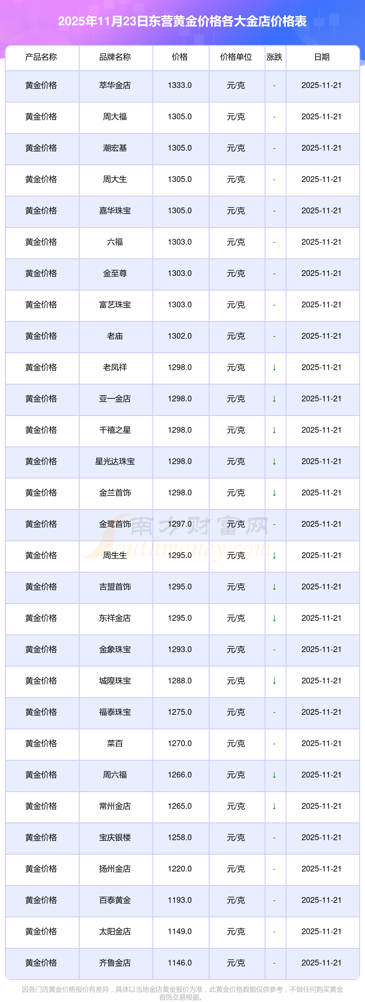2025年11月23日東營各大金店黃金價格最新價格查詢來了:周大福1305.0元/克,周大福616.0元/克,周大福1305.0元/克,周大福45110.0,周大福17570.0,周大福40690.0,周大福1143.0元/克,老鳳祥1298.0元/克,老鳳祥600.0元/克,老鳳祥1298.0元/克,周六福1266.0元/克。