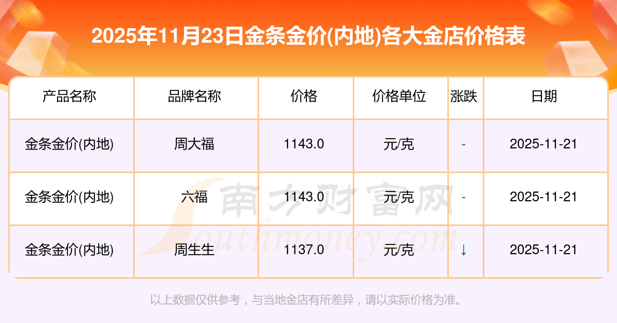 2025年11月23日,周大福、周大福、周大福、周大福、周大福、周大福、周大福、老鳳祥、老鳳祥、老鳳祥、周六福等各大金店品牌金條金價(jià)(內(nèi)地)今日價(jià)格如下:周大福1305.0元/克、周大福616.0元/克、周大福1305.0元/克、周大福45110.0、周大福17570.0、周大福40690.0、周大福1143.0元/克、老鳳祥1298.0元/克、老鳳祥600.0元/克、老鳳祥1298.0元/克、周六福1266.0元/克。