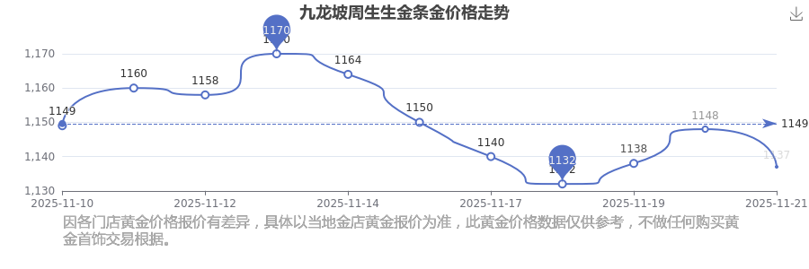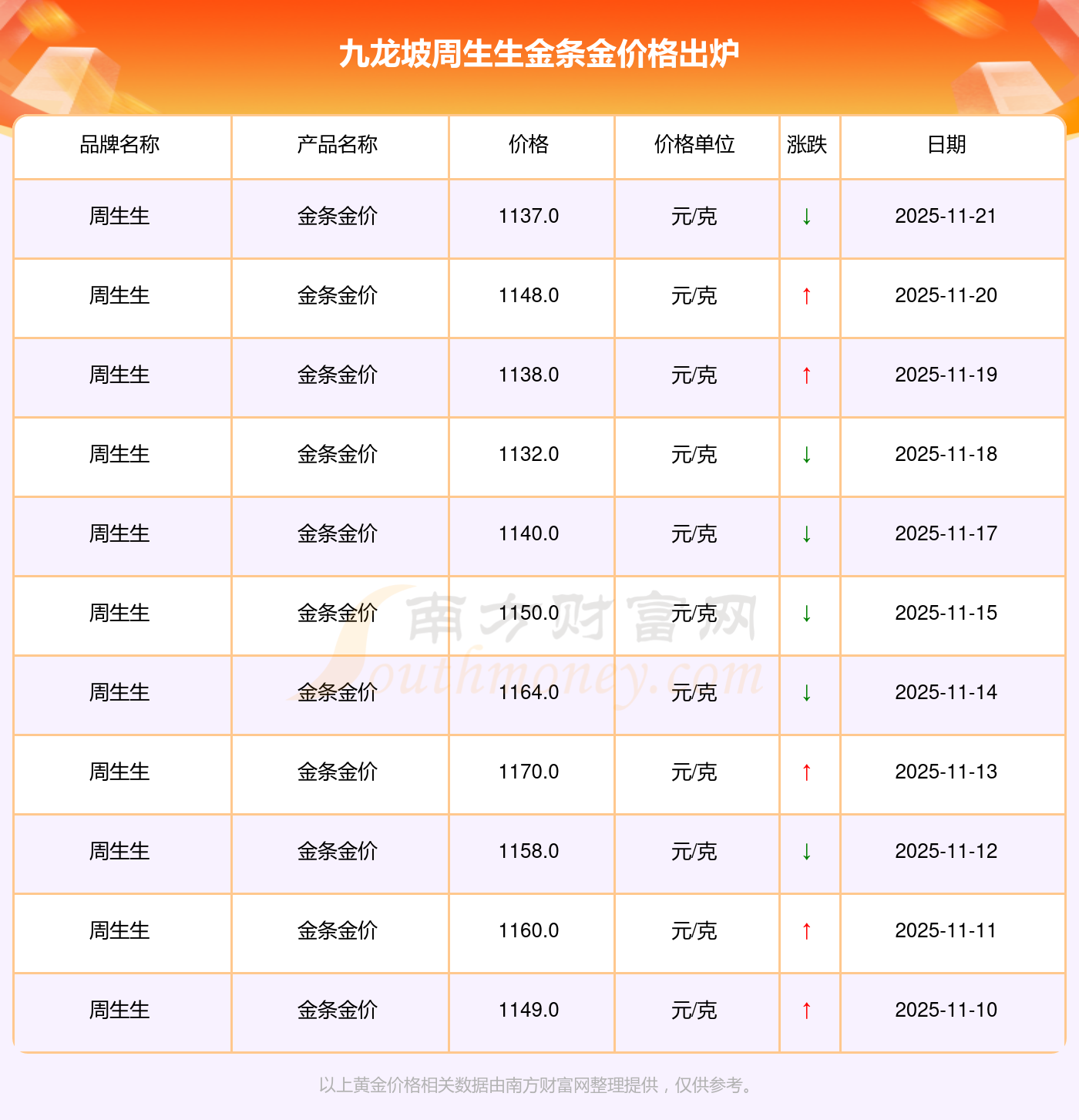 1137.0元/克,這是九龍坡周生生于 2025年11月23日所定的金條金價格。