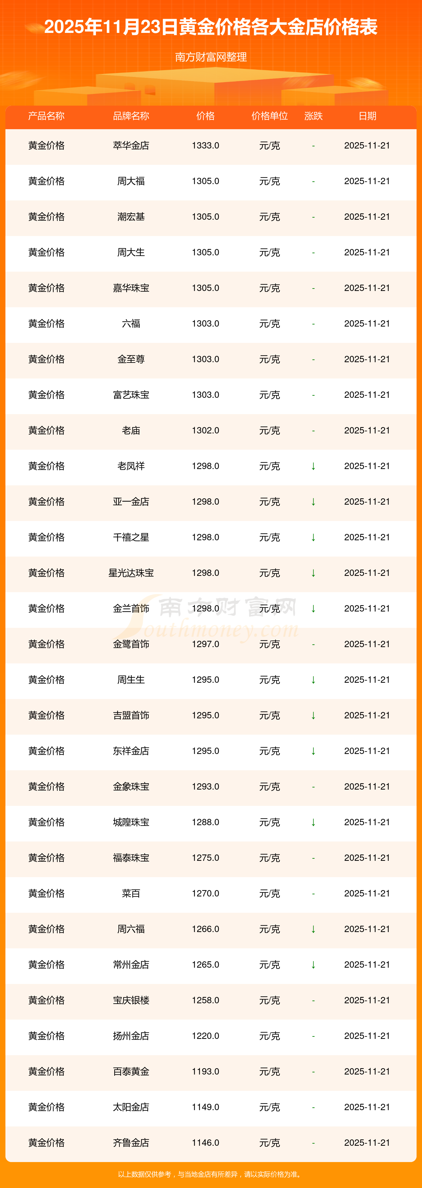 今天是2025年11月23日,周大福、周大福、周大福、周大福、周大福、周大福、周大福、老鳳祥、老鳳祥、老鳳祥、周六福等各大金店品牌黃金價(jià)格最新價(jià)格如下:周大福1305.0元/克、周大福616.0元/克、周大福1305.0元/克、周大福45110.0、周大福17570.0、周大福40690.0、周大福1143.0元/克、老鳳祥1298.0元/克、老鳳祥600.0元/克、老鳳祥1298.0元/克、周六福1266.0元/克。