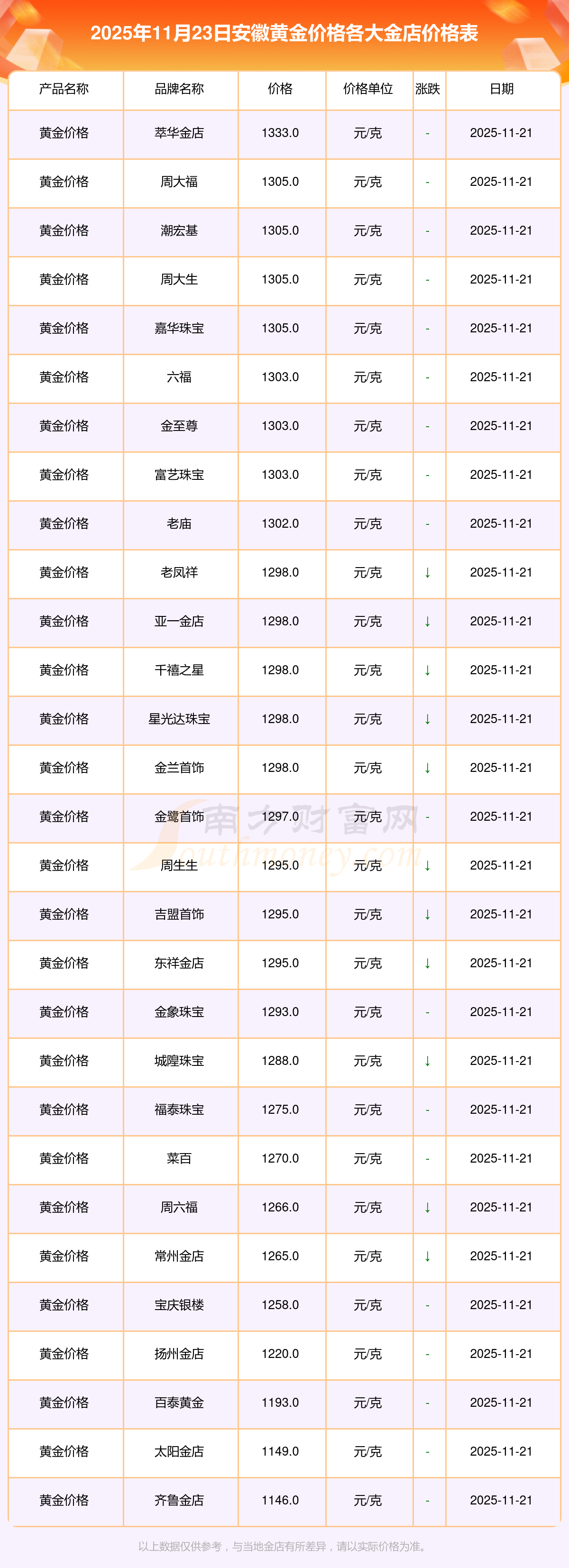 2025年11月23日安徽周大福、周大福、周大福、周大福、周大福、周大福、周大福、老鳳祥、老鳳祥、老鳳祥、周六福等各大金店品牌黃金價(jià)格最新價(jià)格行情來(lái)了,如下:周大福黃金價(jià)格1305.0元/克,周大福鉑金價(jià)格616.0元/克,周大福飾品金價(jià)(內(nèi)地)1305.0元/克,周大福黃金飾品(香港)45110.0,周大福鉑金價(jià)格(香港)17570.0,周大福金條價(jià)格(香港)40690.0,周大福金條金價(jià)(內(nèi)地)1143.0元/克,老鳳祥黃金價(jià)格1298.0元/克,老鳳祥鉑金價(jià)格600.0元/克,老鳳祥足金價(jià)格1298.0元/克,周六福黃金價(jià)格1266.0元/克。