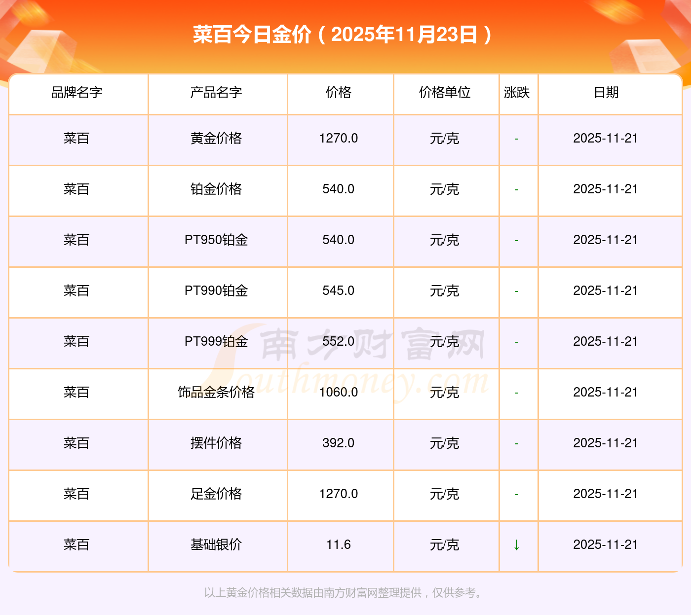 現(xiàn)在菜百金條價格多少錢一克?今天黃金價格多少,2025年11月23日菜百鉑金價格現(xiàn)在每克多少錢?最新菜百鉑金價格報價公布,一起來看看吧!