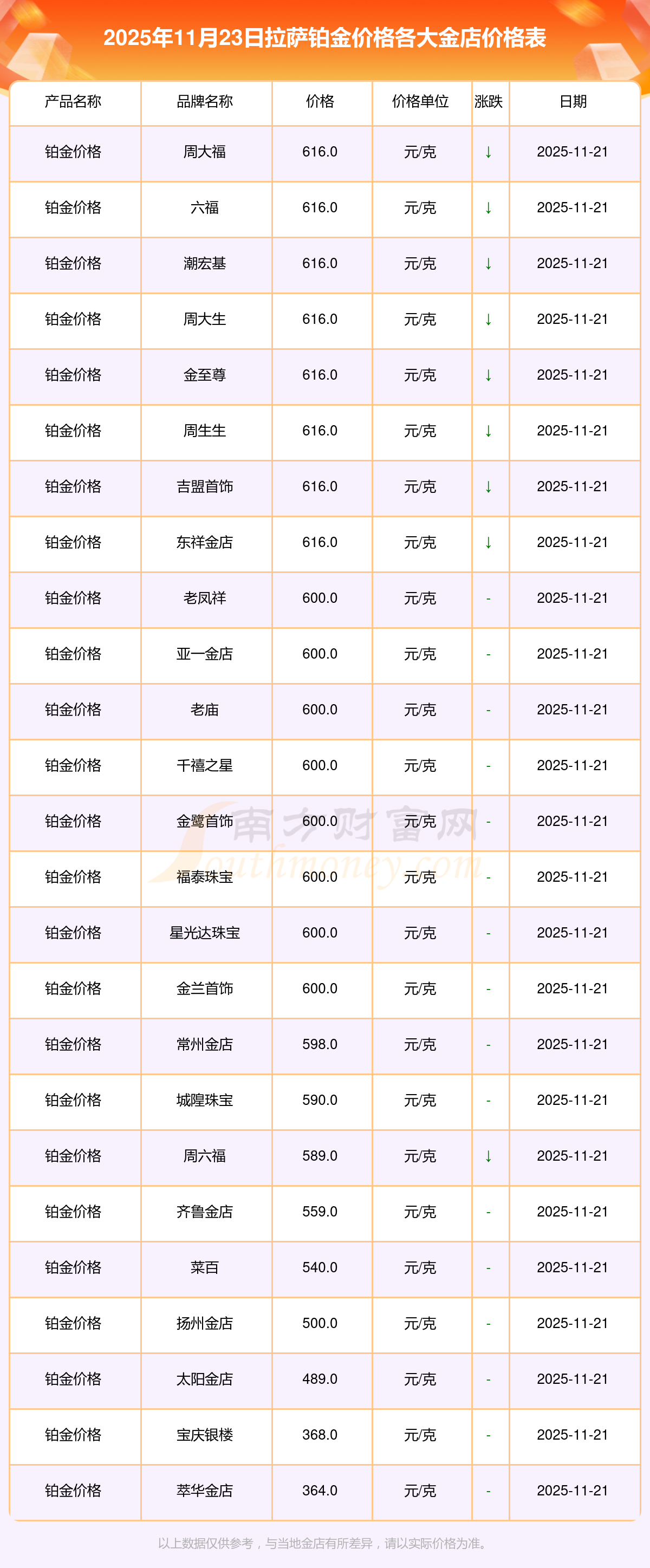 2025年11月23日,拉薩周大福、周大福、周大福、周大福、周大福、周大福、周大福、老鳳祥、老鳳祥、老鳳祥、周六福等各大金店品牌鉑金價(jià)格今日價(jià)格如下:周大福1305.0元/克、周大福616.0元/克、周大福1305.0元/克、周大福45110.0、周大福17570.0、周大福40690.0、周大福1143.0元/克、老鳳祥1298.0元/克、老鳳祥600.0元/克、老鳳祥1298.0元/克、周六福1266.0元/克。