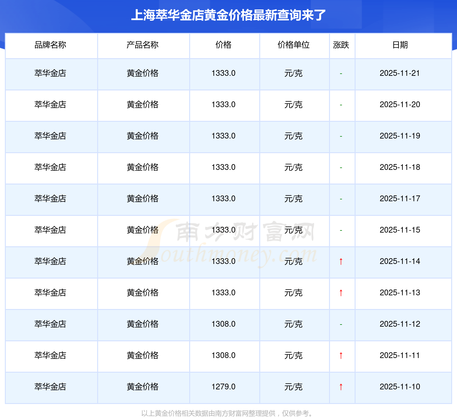 今日上海萃華金店黃金價(jià)格的價(jià)格為1333.0元/克。