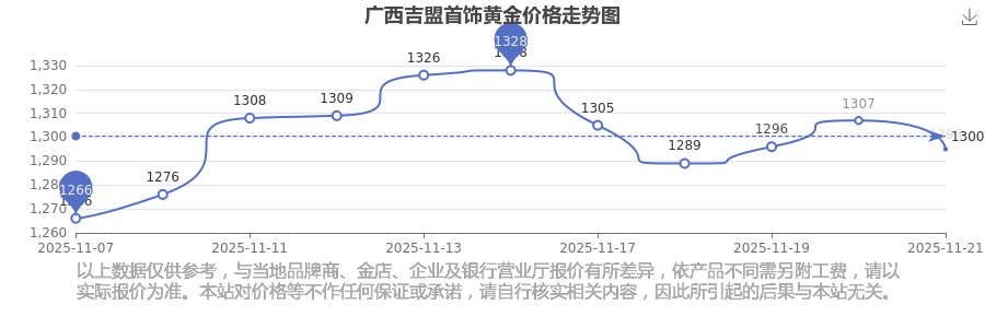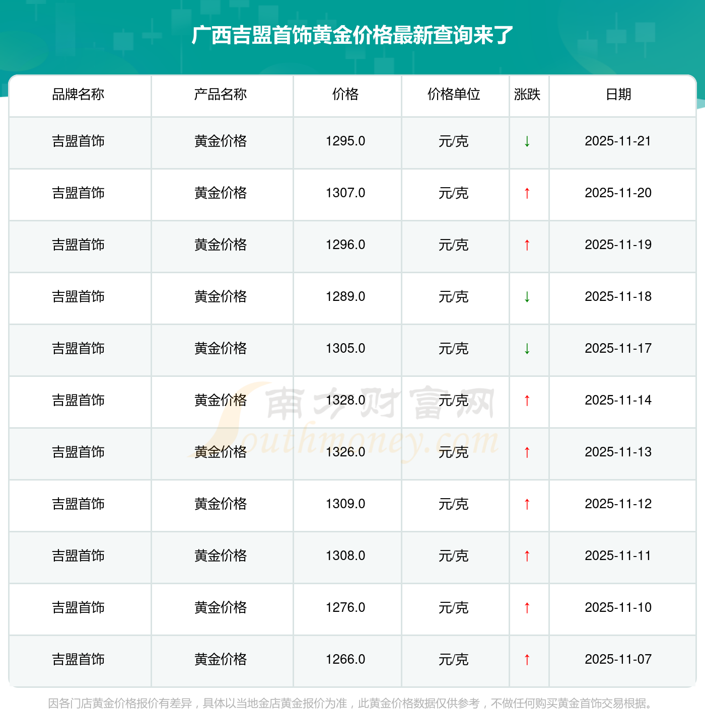 2025年11月23日,廣西吉盟首飾黃金價格每克的售賣價位為1295.0元/克。
