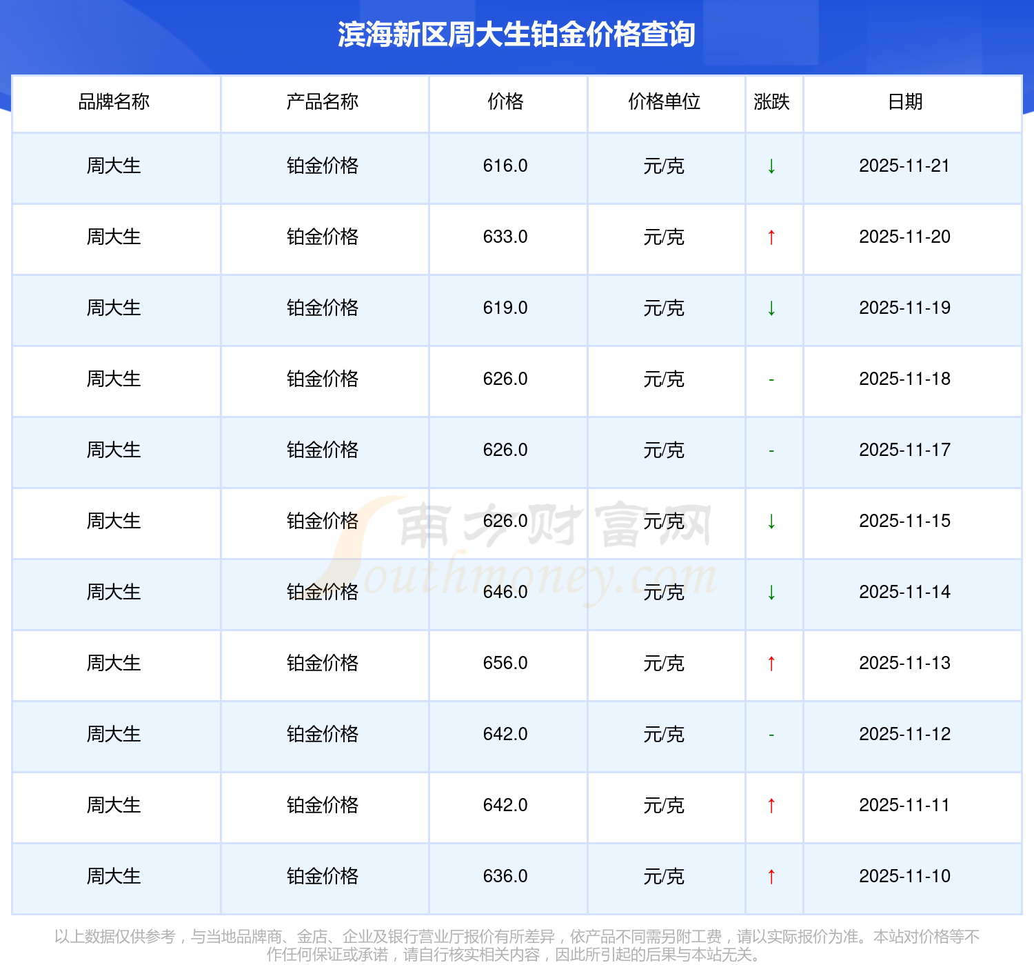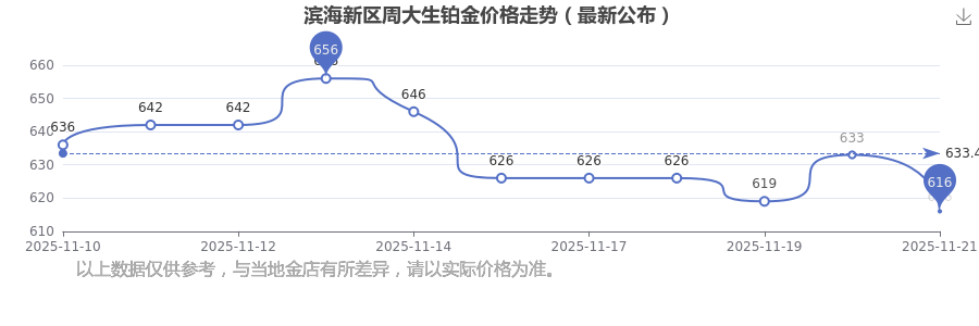 616.0元/克,這是濱海新區(qū)周大生于 2025年11月23日所定的鉑金價格。