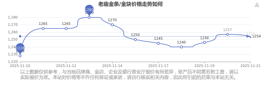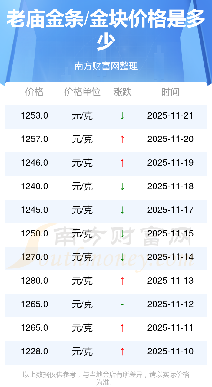 今日老廟金條/金塊價(jià)格為1253.0元/克。