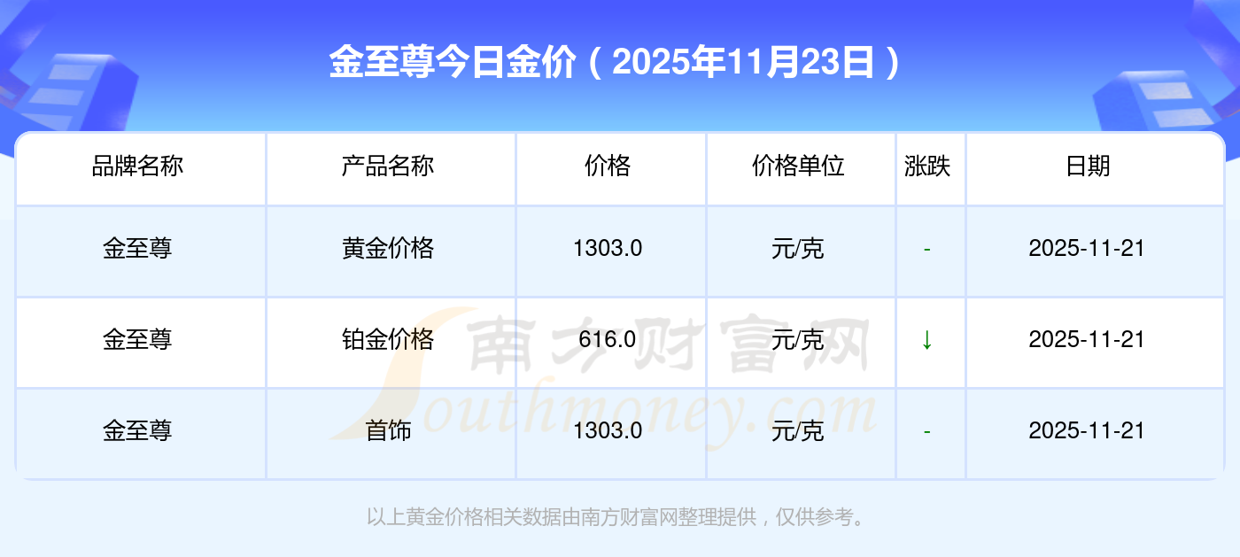 2025年11月23日金至尊今日價(jià)格:黃金價(jià)格1305.0元/克,鉑金價(jià)格616.0元/克,飾品金價(jià)(內(nèi)地)1305.0元/克,黃金飾品(香港)45110.0,鉑金價(jià)格(香港)17570.0,金條價(jià)格(香港)40690.0,金條金價(jià)(內(nèi)地)1143.0元/克,黃金價(jià)格1298.0元/克,鉑金價(jià)格600.0元/克,足金價(jià)格1298.0元/克,黃金價(jià)格1266.0元/克。
