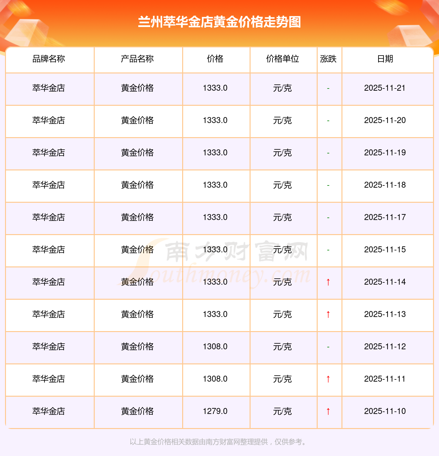 今日2025年11月23日,蘭州萃華金店黃金價(jià)格為1333.0元/克。