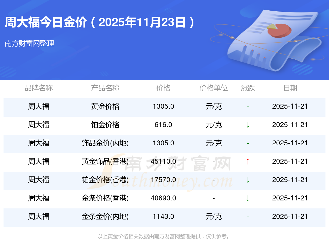 2025年11月23日周大福、周大福、周大福、周大福、周大福、周大福、周大福、老鳳祥、老鳳祥、老鳳祥、周六福等各大金店品牌飾品金價(jià)(內(nèi)地)最新價(jià)格如下:周大福黃金價(jià)格1305.0元/克,周大福鉑金價(jià)格616.0元/克,周大福飾品金價(jià)(內(nèi)地)1305.0元/克,周大福黃金飾品(香港)45110.0,周大福鉑金價(jià)格(香港)17570.0,周大福金條價(jià)格(香港)40690.0,周大福金條金價(jià)(內(nèi)地)1143.0元/克,老鳳祥黃金價(jià)格1298.0元/克,老鳳祥鉑金價(jià)格600.0元/克,老鳳祥足金價(jià)格1298.0元/克,周六福黃金價(jià)格1266.0元/克。