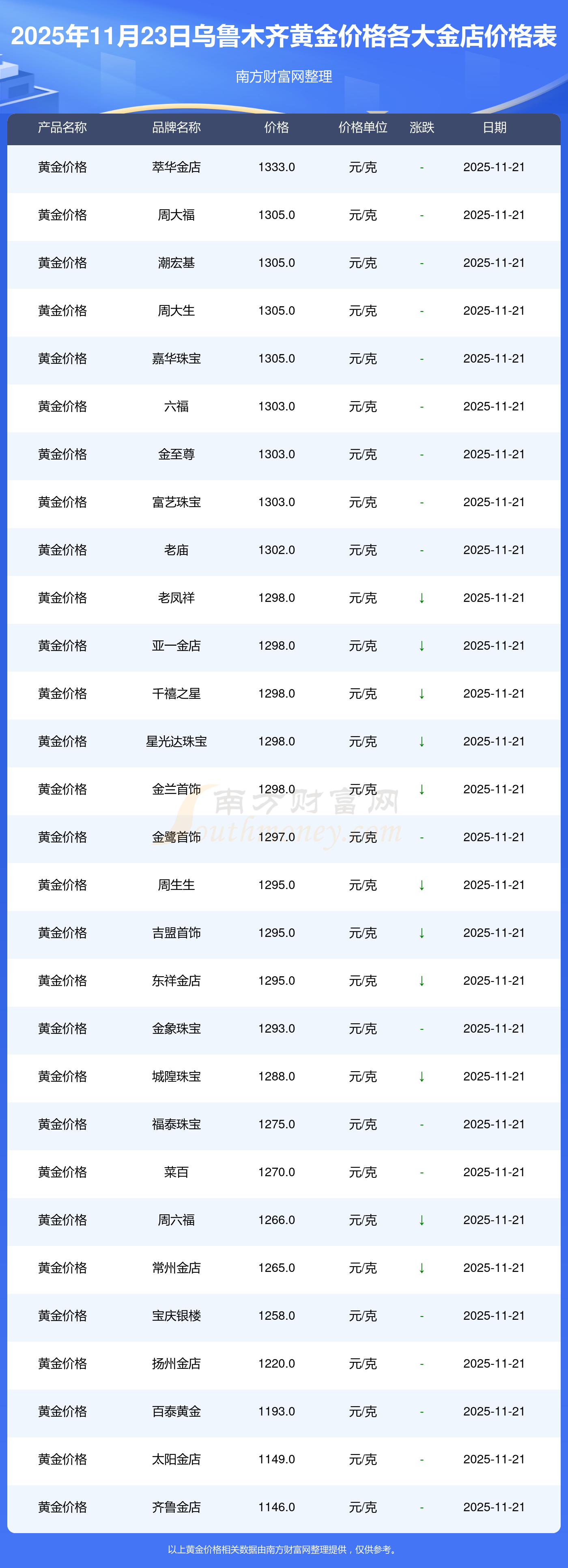 2025年11月23日烏魯木齊周大福、周大福、周大福、周大福、周大福、周大福、周大福、老鳳祥、老鳳祥、老鳳祥、周六福等各大金店品牌黃金價(jià)格最新價(jià)格行情來了,如下:周大福黃金價(jià)格1305.0元/克,周大福鉑金價(jià)格616.0元/克,周大福飾品金價(jià)(內(nèi)地)1305.0元/克,周大福黃金飾品(香港)45110.0,周大福鉑金價(jià)格(香港)17570.0,周大福金條價(jià)格(香港)40690.0,周大福金條金價(jià)(內(nèi)地)1143.0元/克,老鳳祥黃金價(jià)格1298.0元/克,老鳳祥鉑金價(jià)格600.0元/克,老鳳祥足金價(jià)格1298.0元/克,周六福黃金價(jià)格1266.0元/克。
