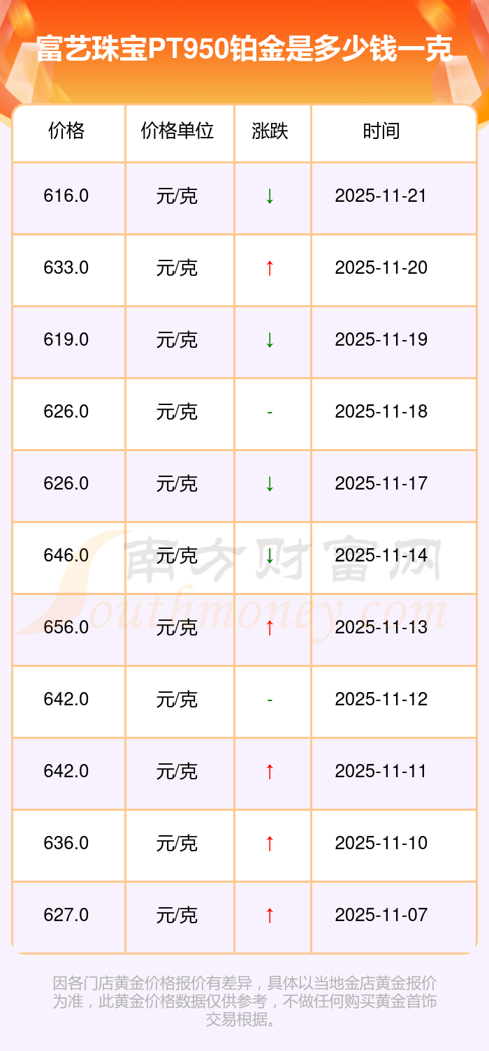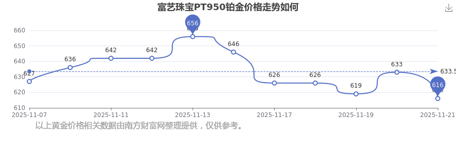 據(jù)了解,今日富藝珠寶 PT950鉑金的最新價格為616.0元/克。