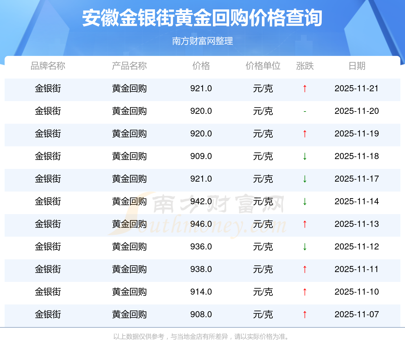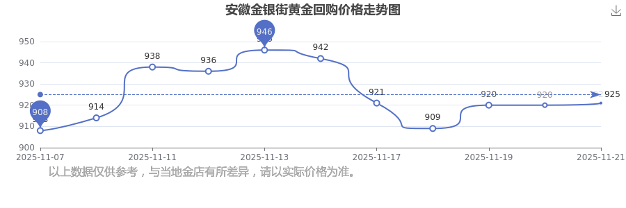 于 2025年11月23日,安徽金銀街黃金回購的克價為921.0元/克。