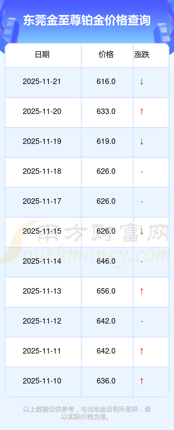 (2025年11月23日)今日東莞金至尊鉑金價(jià)格是616.0元/克。