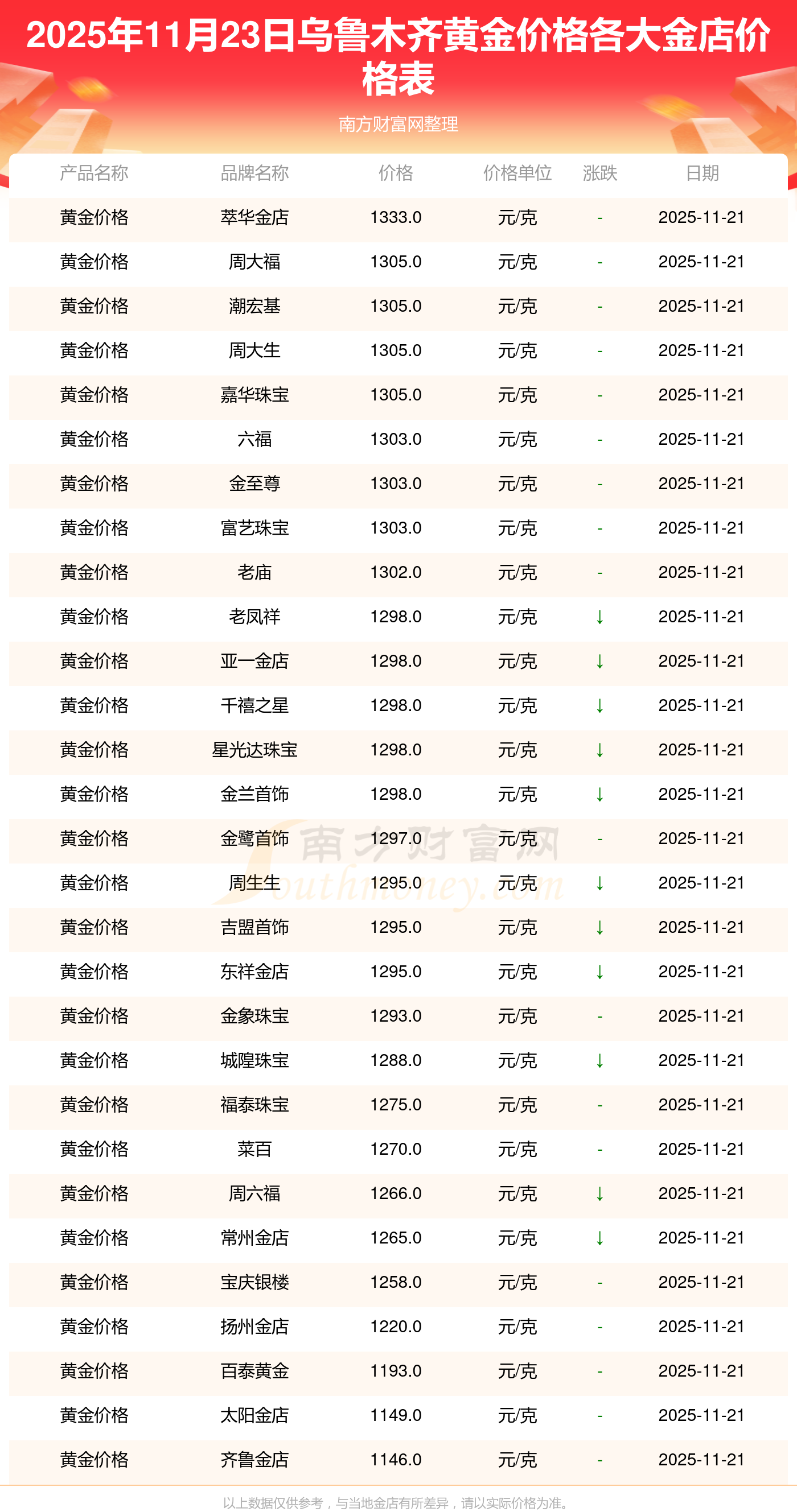 今日烏魯木齊黃金價格最高的金店是萃華金店,報價1333.0元/克,黃金價格最低的金店是齊魯金店,報價1146.0元/克。今日黃金價格高低差為187元/克。