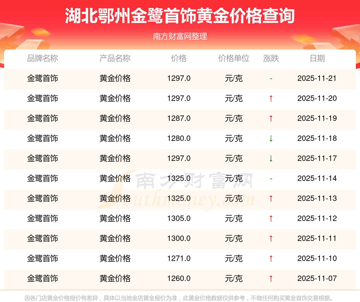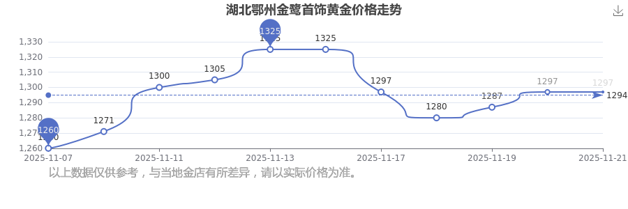 2025年11月23日這一天,湖北鄂州金鷺首飾的黃金價格以 1297.0元/克的價格售賣。