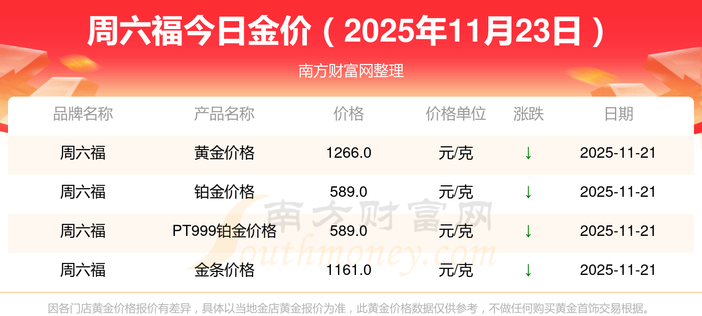 2025年11月23日各大金店黃金價(jià)格最新價(jià)格:周大福1305.0元/克,周大福616.0元/克,周大福1305.0元/克,周大福45110.0,周大福17570.0,周大福40690.0,周大福1143.0元/克,老鳳祥1298.0元/克,老鳳祥600.0元/克,老鳳祥1298.0元/克,周六福1266.0元/克。