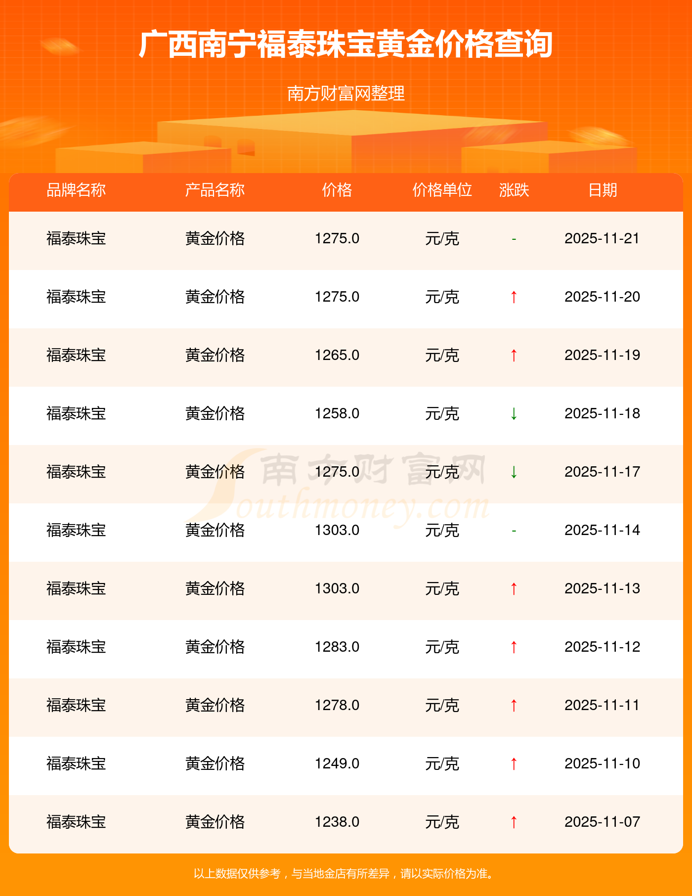 今日廣西南寧福泰珠寶黃金價格公布今天,按克計(jì)價的黃金價格是多少今日(2025年11月23日),廣西南寧福泰珠寶黃金價格的價格是1275.0元/克。