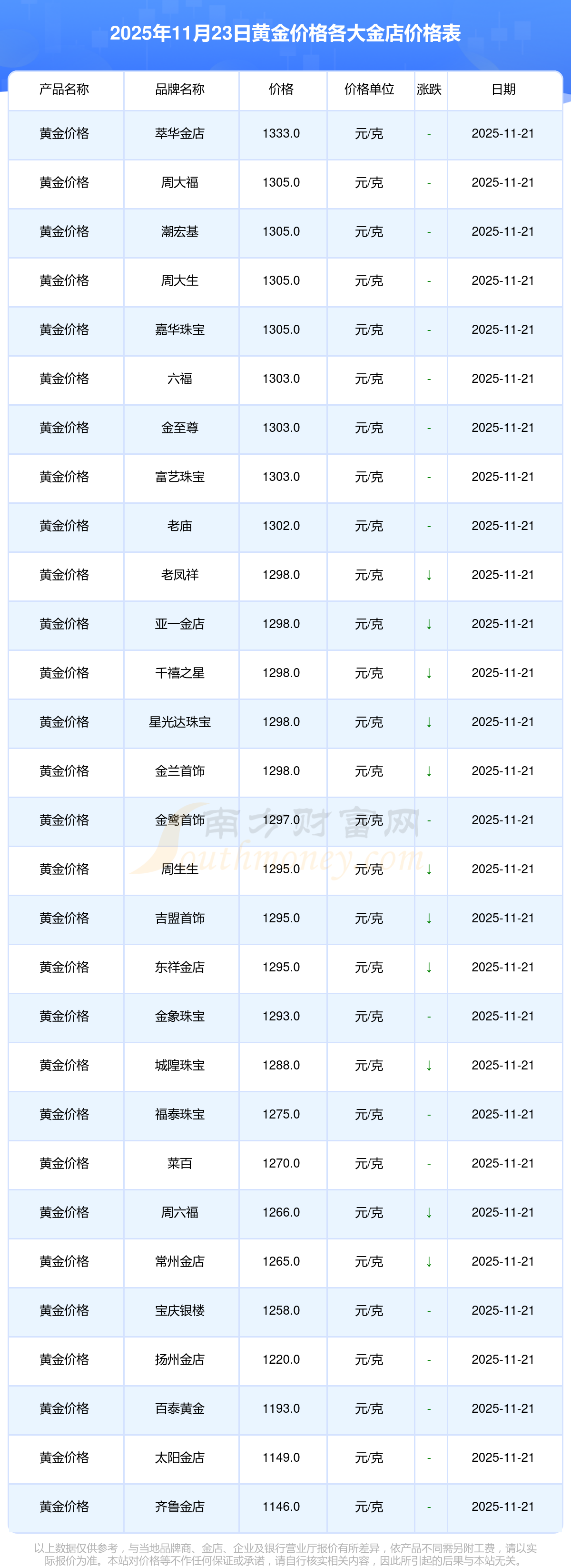 2025年11月23日各大金店黃金價格最新價格:周大福1305.0元/克,周大福616.0元/克,周大福1305.0元/克,周大福45110.0,周大福17570.0,周大福40690.0,周大福1143.0元/克,老鳳祥1298.0元/克,老鳳祥600.0元/克,老鳳祥1298.0元/克,周六福1266.0元/克。