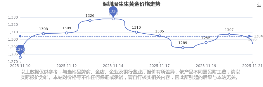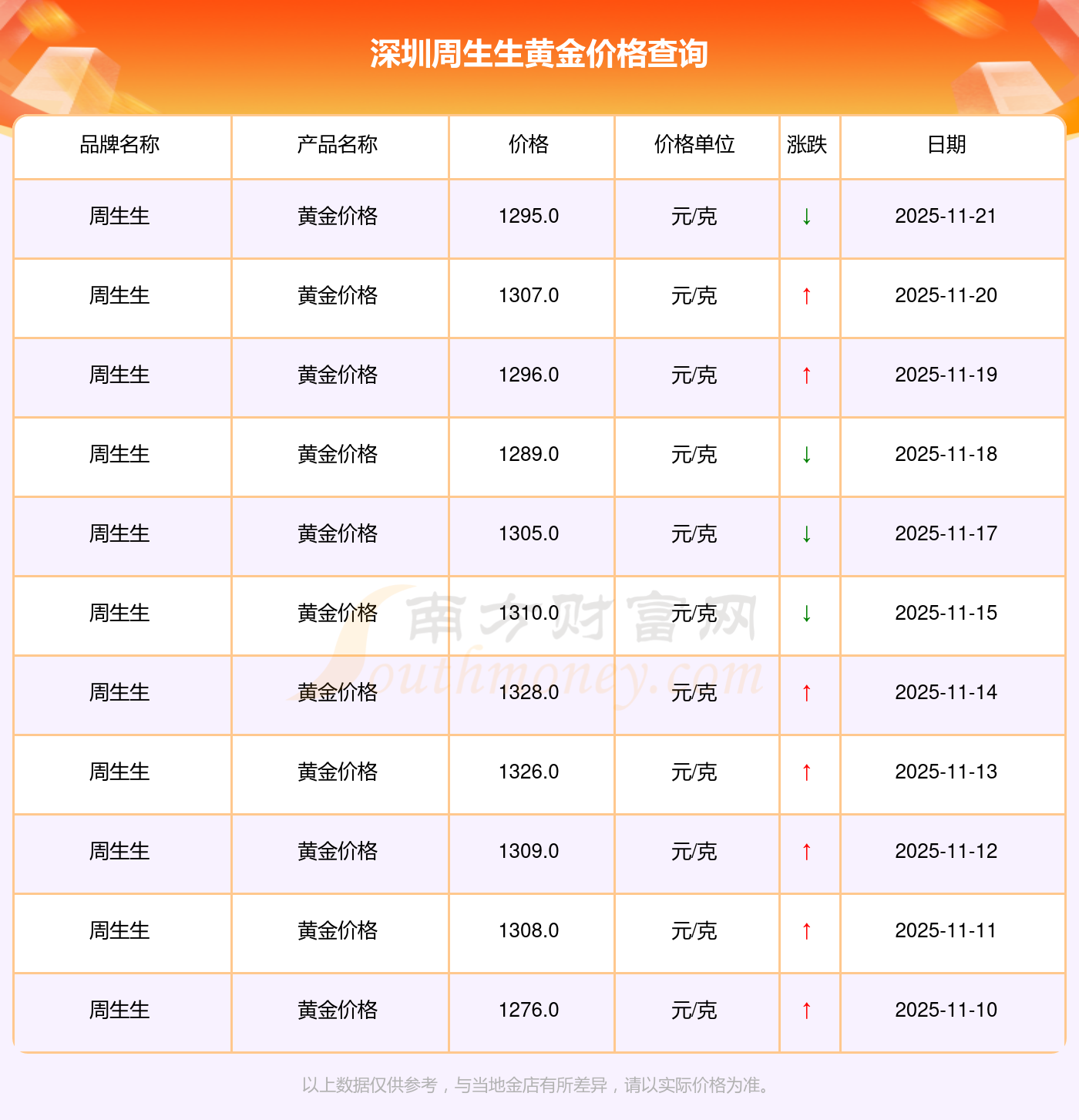 2025年11月23日深圳周生生黃金價格是1295.0元/克。